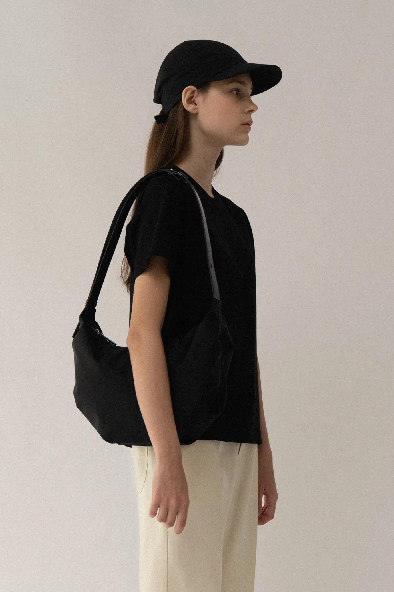 Round hobo shape made of nylon. The strap has 6 generous holes for length adjustment, so it can be worn cross-body or shoulder. The inner pocket provides easy storage. Heavy twill material provides excellent practicality. Soft touch and subtle sheen for vivid color. Nylon material for a cool feel. Please refer to the detail cut for product color. * Please note that purchases are limited to 1 per person due to cases of unfair profits being made through resale.