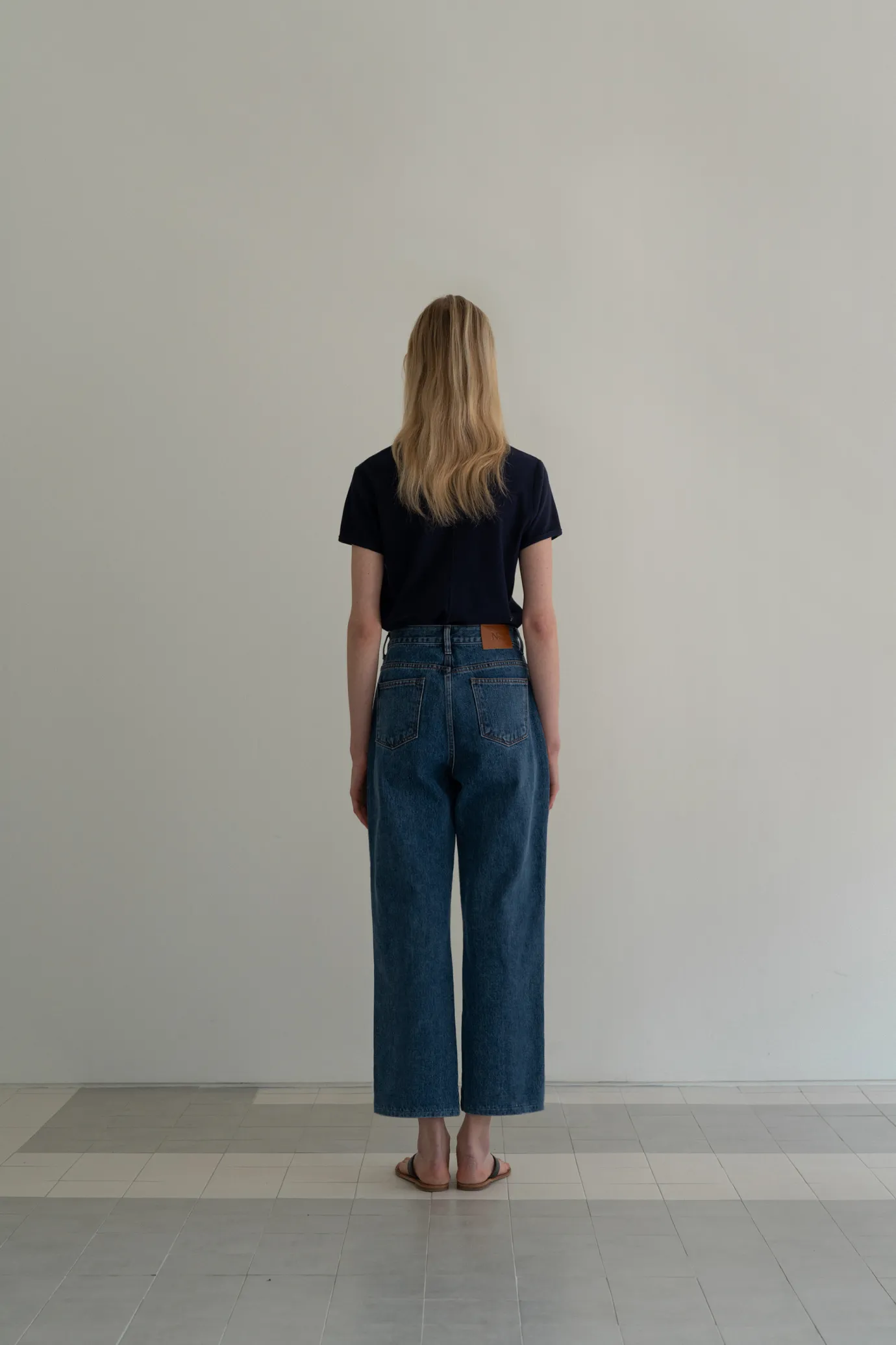 Blue jeans with a wide silhouette. Soft material with post-processing treatment. Consists of two pockets on the front and two pockets on the back. Button and zipper fly closure. Please be careful when wearing light-colored clothing. For product color, please refer to the detail cut.