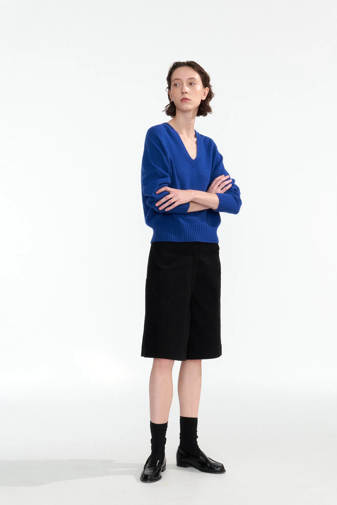 This is a basic V-NECK knit that is true to the basics. It has a generous and relaxed oversized silhouette and a wide ribbed texture on the sleeves and hem, creating a silhouette with elasticity and volume. The cashmere blend adds warmth and is made with a seamless whole garment method, providing a soft feel and natural fit.
