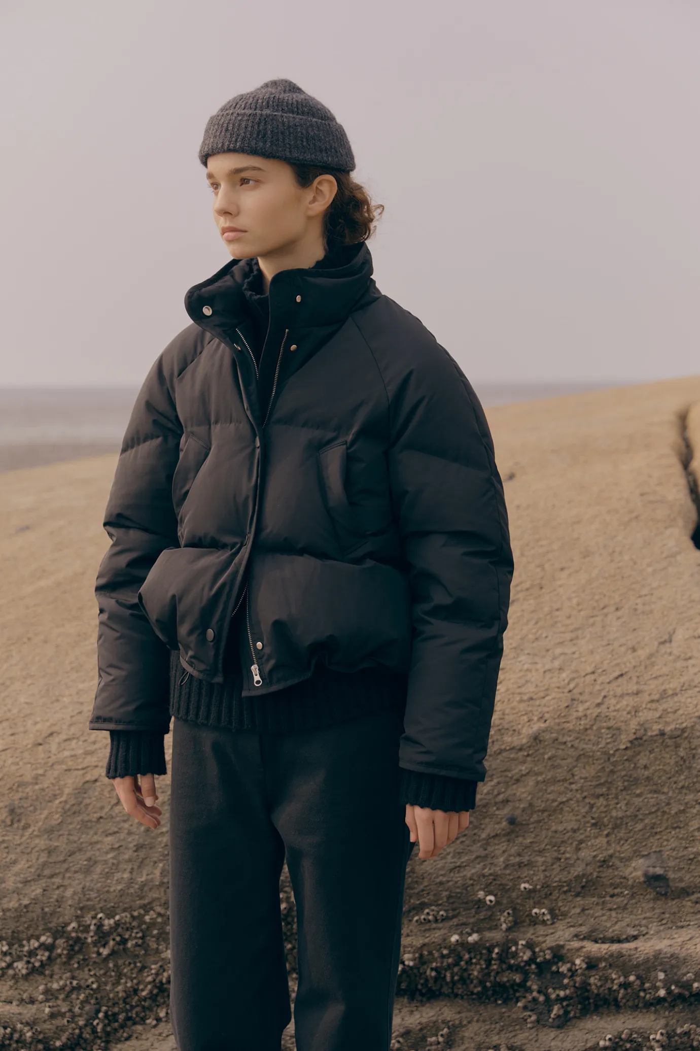 This is a premium goose down with a 90:10 ratio that boasts the best heat retention among goose down products. The white goose down filling with fill power 700 and the fluff made from the goose's chest area have a high air content that can hold warm air, so it has better heat retention than the feathers on the wings. 90 goose down products boast a high quality as the ratio of fluff collected in small quantities is high with 90% fluff and 10% feathers. It has a crop fit, drop shoulder, stand collar, and snap fastening structure. It maintains a light padding weight with a cotton and polyester blend material. The size can be adjusted with the strings and stoppers on both sides of the lower inside, and the waist string allows for various styles.