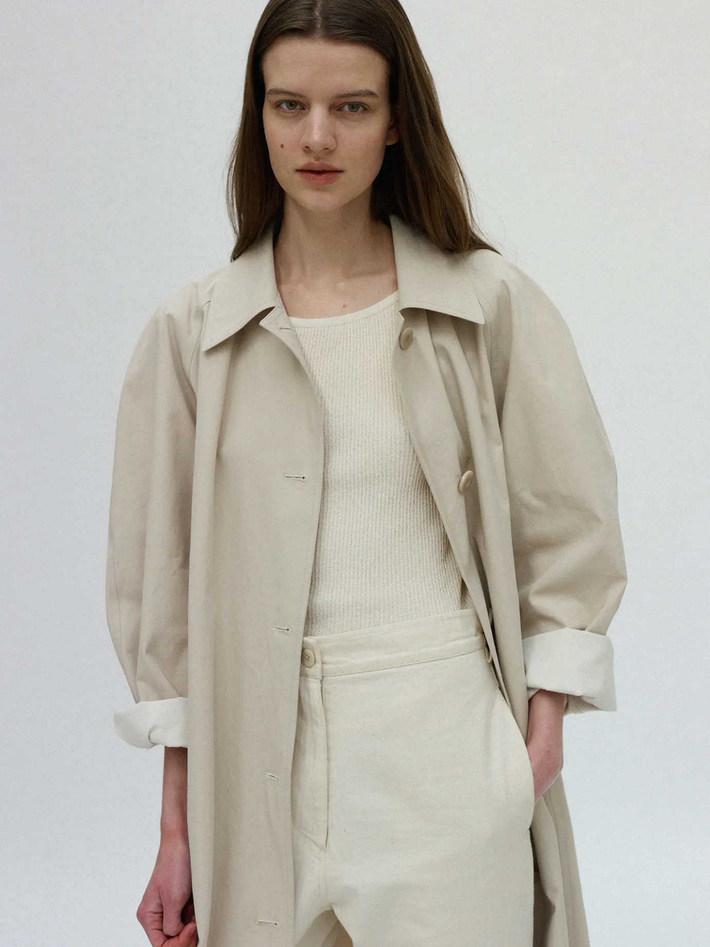 An oversized single trench coat with an attractive voluminous shoulder. Made of 100% gabardine COTTON material with a natural texture and solidity, it is composed of 29 high-density twill tissues and is a good item to wear lightly during the change of seasons. It boasts comfortable activity with a deep back slit and features five big-sized glossy buttons and high-end sewing details with the Natting Litton logo imprinted on them. It consists of both side welt pockets on the front and the lining is made of thin and soft cotton fabric.