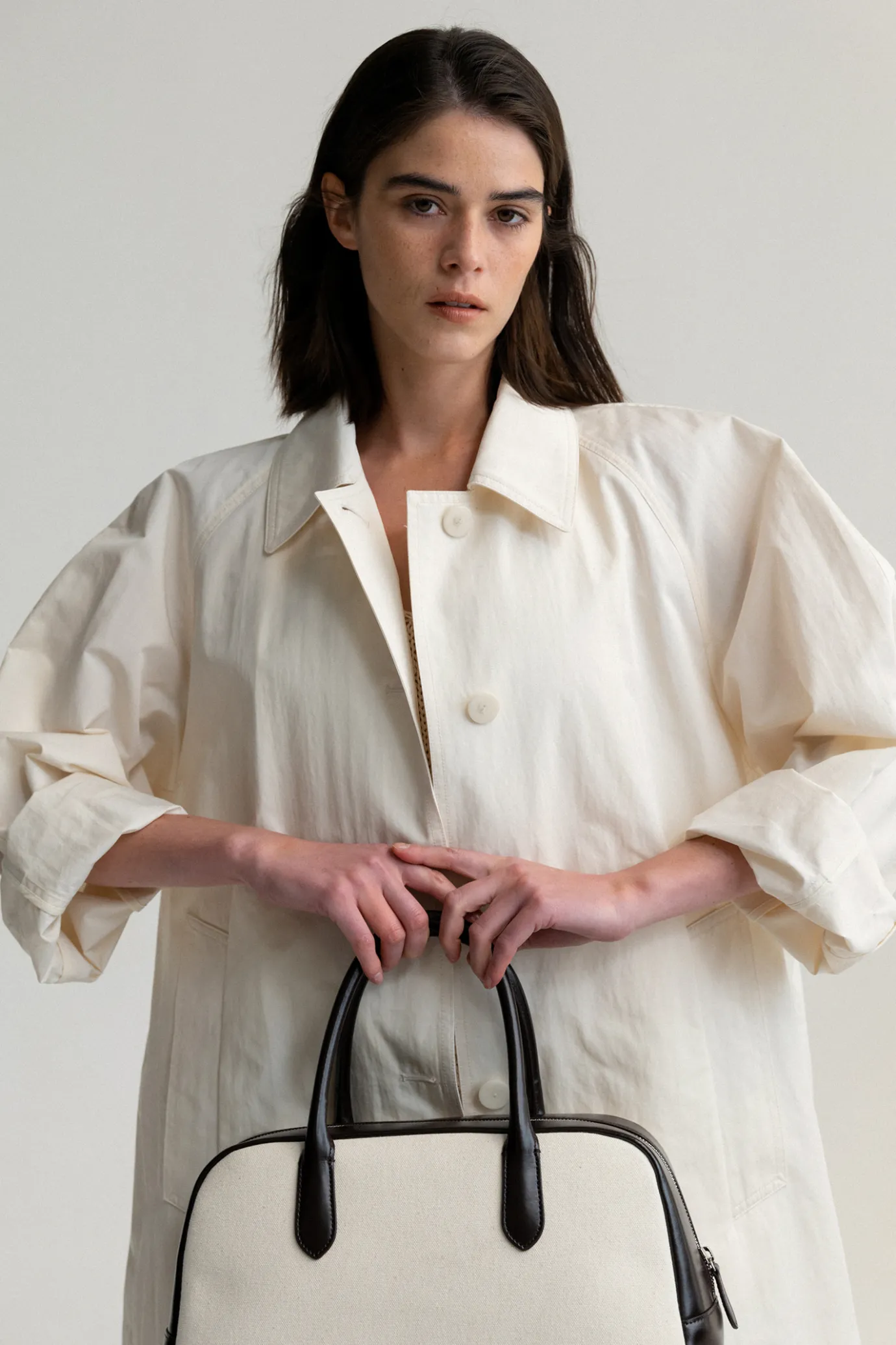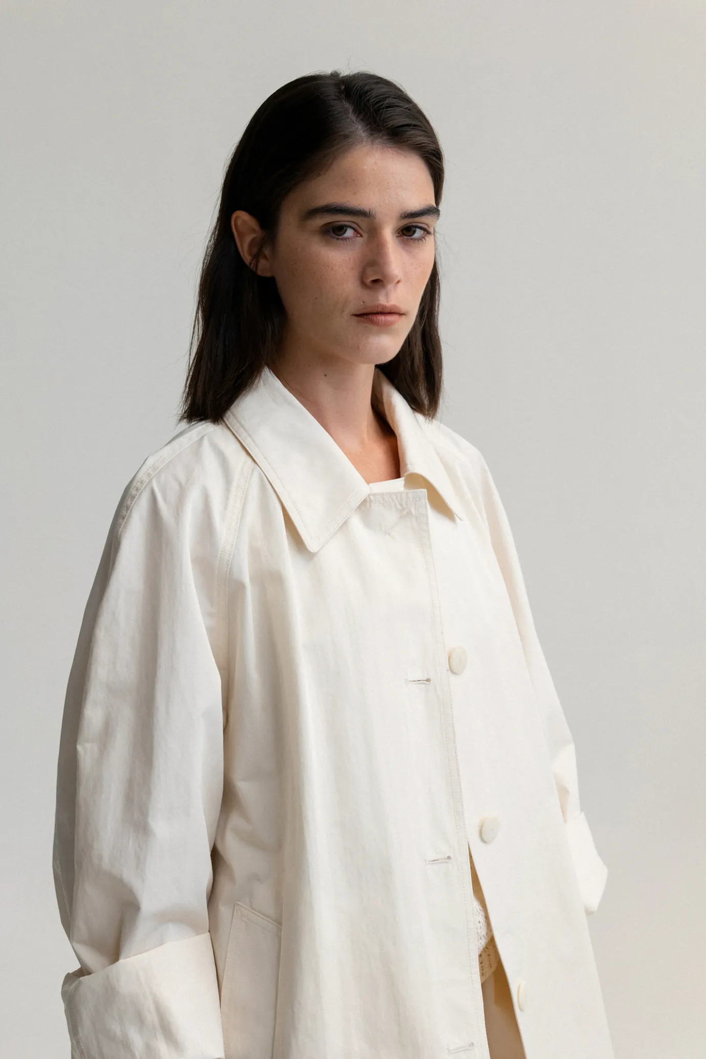 This is a minimal trench coat with three-dimensional shoulders and a midi length. The voluminous sleeve line provides a relaxed silhouette, and the durable cotton and nylon blend makes it a highly versatile item in midsummer. It has both side welt pockets and a front button fastening structure, and the unlined design provides a cool feel. Overall, a clean finish was added to the Harry finish to enhance the degree of completion.