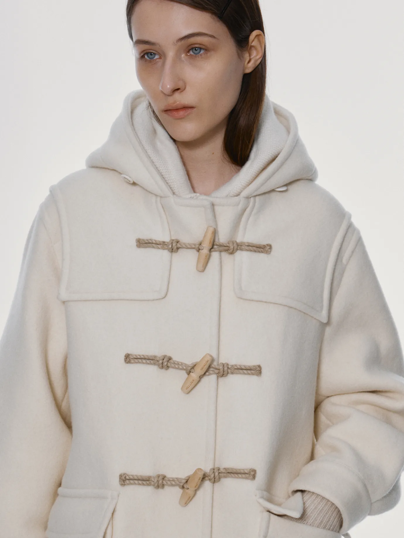 This is a hooded duffel coat with a classic oversized silhouette. It provides a stable fit and casual mood with a relaxed size and a concise design. It is a material with a combination of wool and nylon that boasts excellent warmth, feels thick, and stands out for its brushed hair with a peeling-processed fabric. The hood and collar neck panel structure and the sleeve line that falls in round shape are wide with pin jaw details to enhance volume and prevent body temperature loss from the cold wind in winter. Logo-emblazoned wooden toggle and string ring 3 closing structures, drop shoulder and out pocket design, and 1 button structure with sleeve logo.