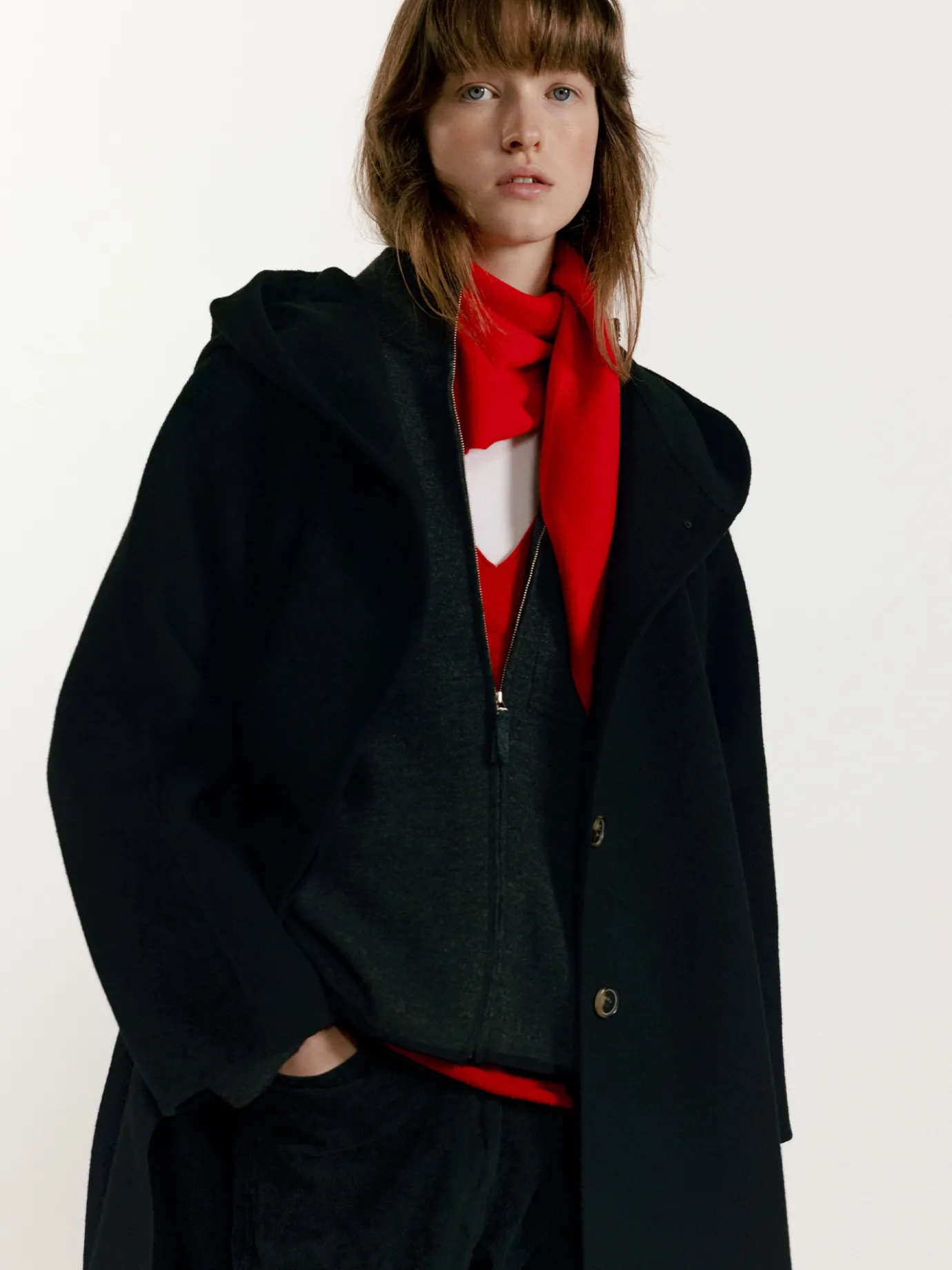 The loose-fitting hooded coat is an attractive item that combines comfort and style. The loose fit and soft touch of 100% lambswool material create a natural line and can be worn comfortably by anyone regardless of body type. The wide hood detail not only adds practicality, but also emphasizes the casual atmosphere and keeps you warm even in cold weather. The ample silhouette and quilted lining using 3M Thinsulate filling minimize weight while maintaining warmth even in winter, providing a comfortable fit. The rounded raglan sleeve design creates a simple yet sophisticated mood, and the practical outer pockets on both sides and the four-button fastening structure add an elegant style without losing everyday convenience.