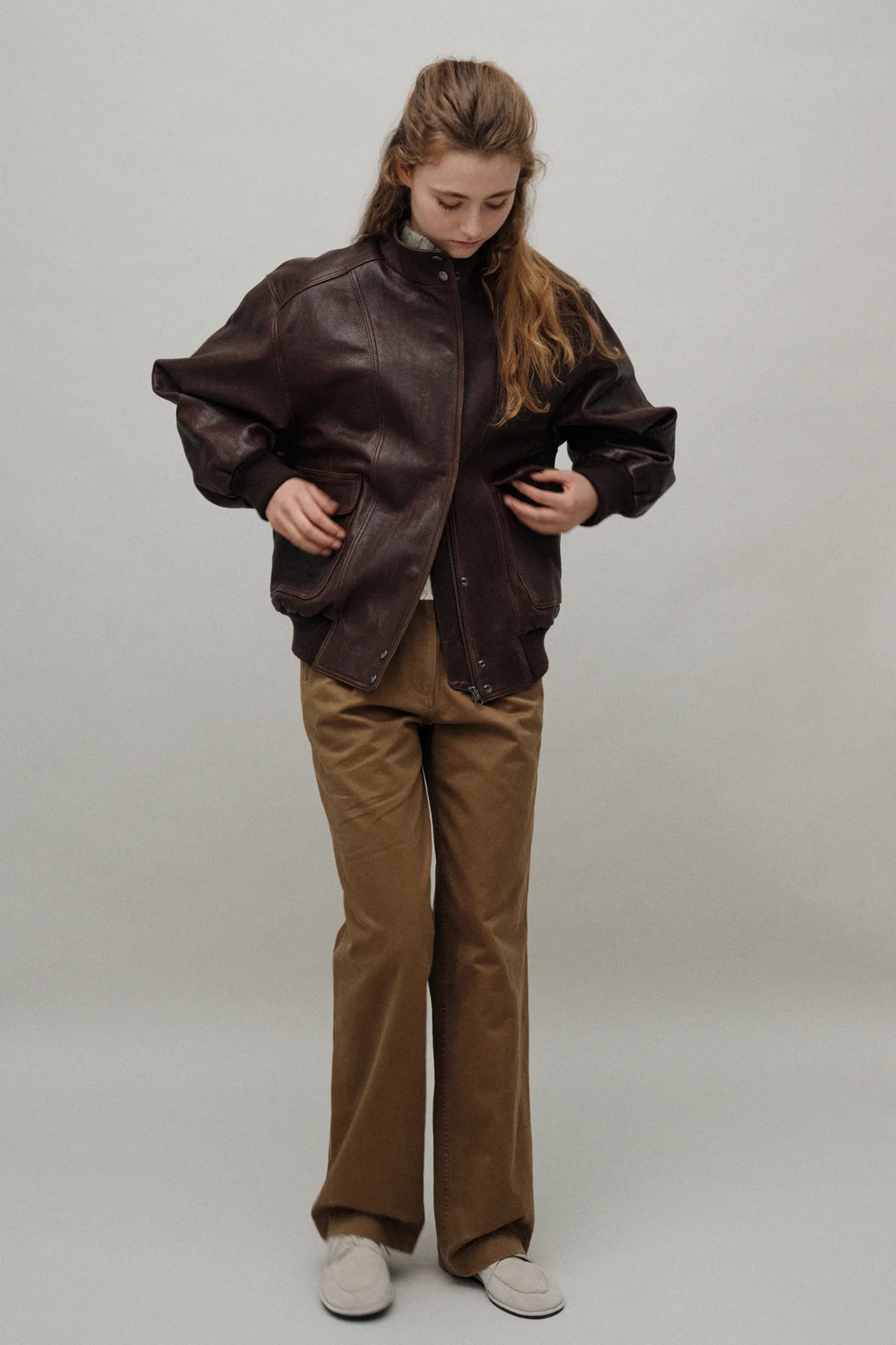 It is a leather blue species characterized by a subtle gloss and vintage scratch texture.Shaving processing provides a lighter weight for a comfortable fit, and elegant crack details that form naturally over time add a luxurious charm.It boasts a shape that does not collapse with its unique thickness and excellent durability, and creates a neutral mood with an oversized silhouette.The windproof stand collar design and vintage snap buttons add casual sensibility and finish with sleeves and waist hemlines for a comfortable fit.The outer and inner pockets on both sides increase practicality, and the double closing structure of the YKK zipper and snap button enhances warmth.