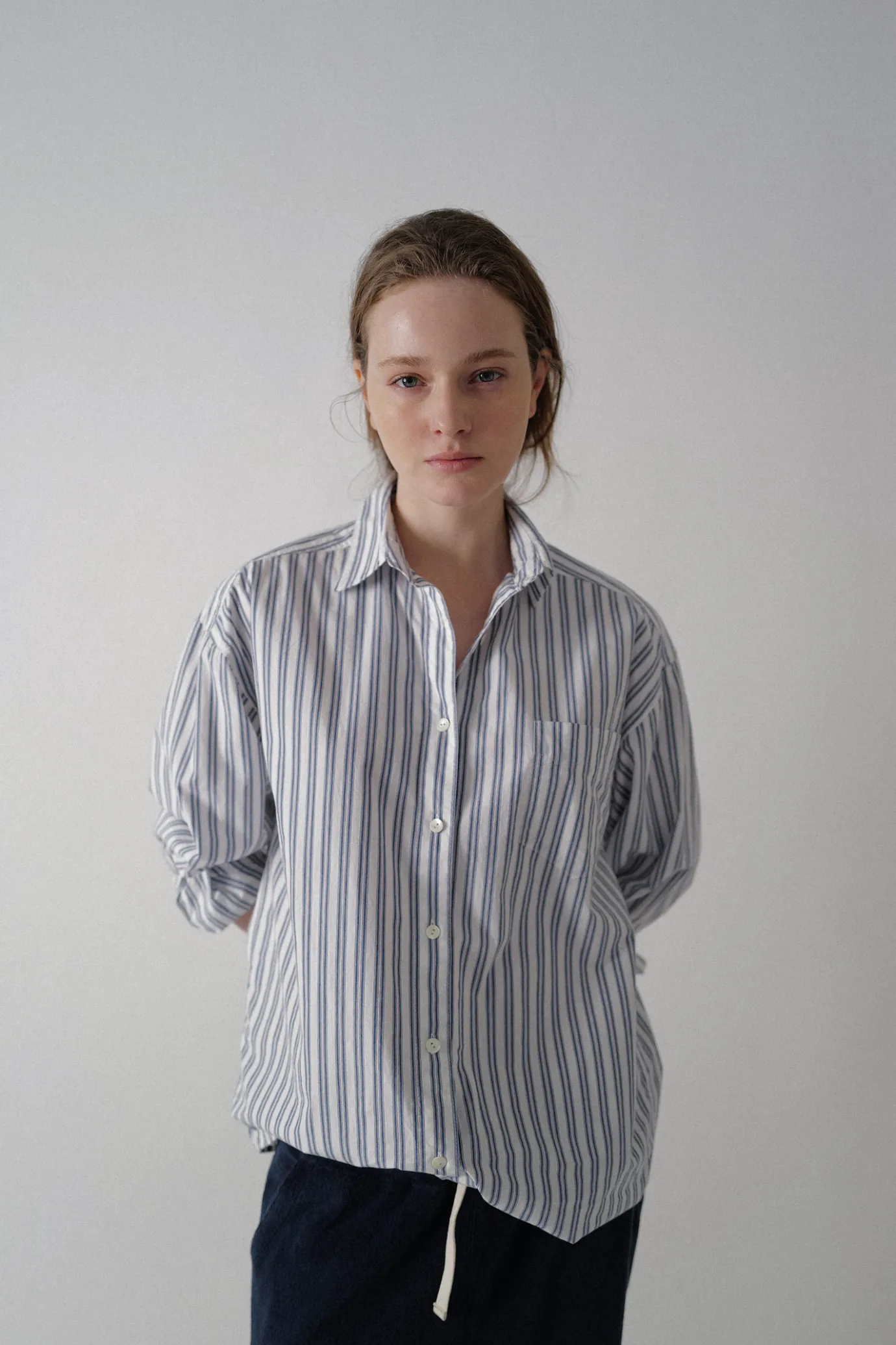 It’s a basic oversized shirt with a vintage mood.It is a blue color with a basic stripe pattern, and it is a highly usef…