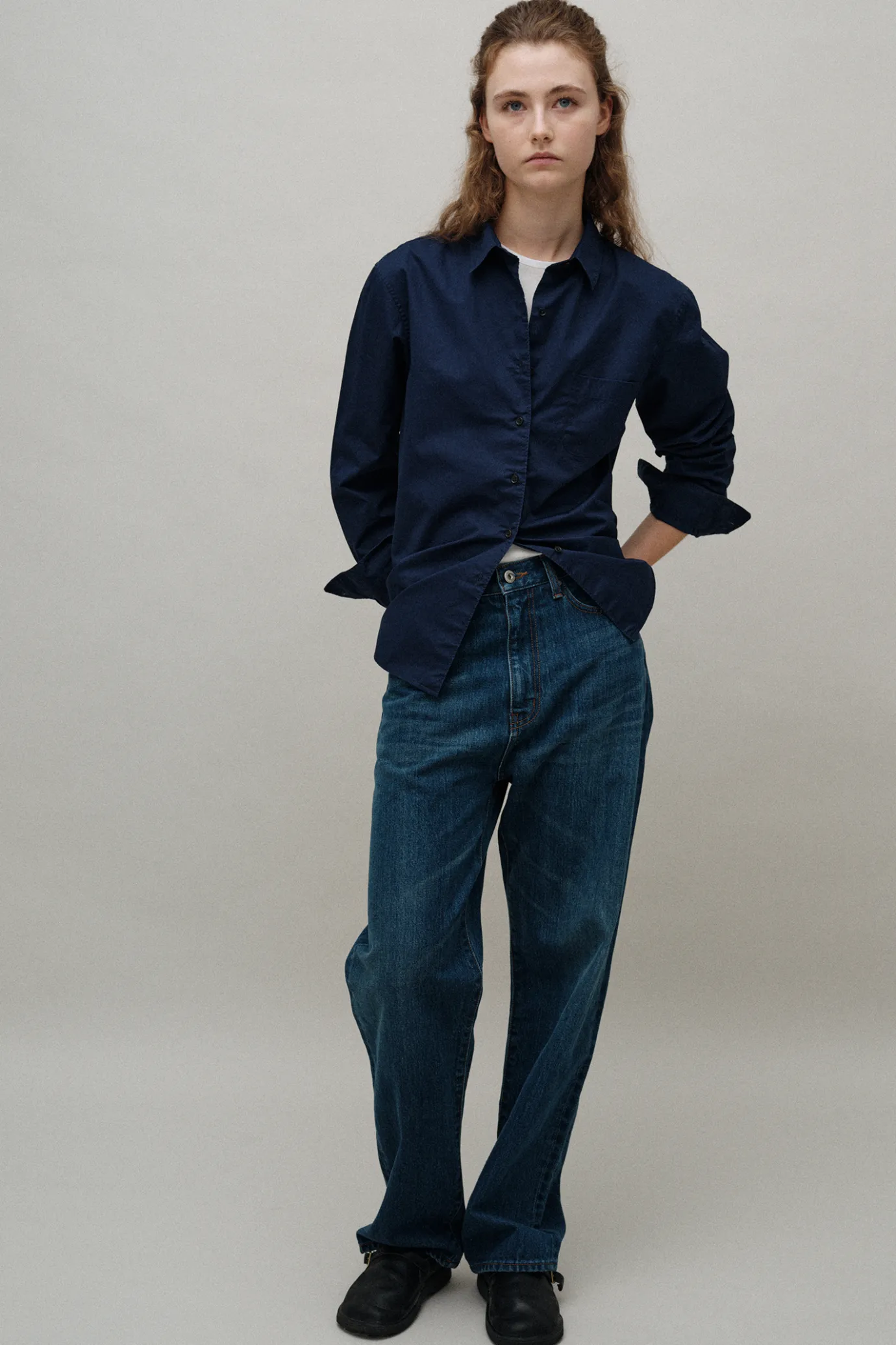 This is a standard fit shirt made of 100% COTTON with light material.It presents a classic and casual mood with a basic silhouette, and it is a good product to style with other products alone with an appropriate length.On the front, the seven key-shell mother-of-pearl buttons are a rare material among mother-of-pearl types, and each button is a natural product with its own beauty. Each button is characterized by a variety of unique colors and patterns, and the natural diversity of unique objects adds a special charm to the product. You can enjoy a variety of colors and textures even within a single product, and it’s a special pleasure that only natural materials can give.Bio-washing is lengthened to create a vintage feel by giving the fabric natural wear and color change.It boasts an appropriate thickness and durability, and adds post-processing washing to provide a soft texture and a comfortable fit.