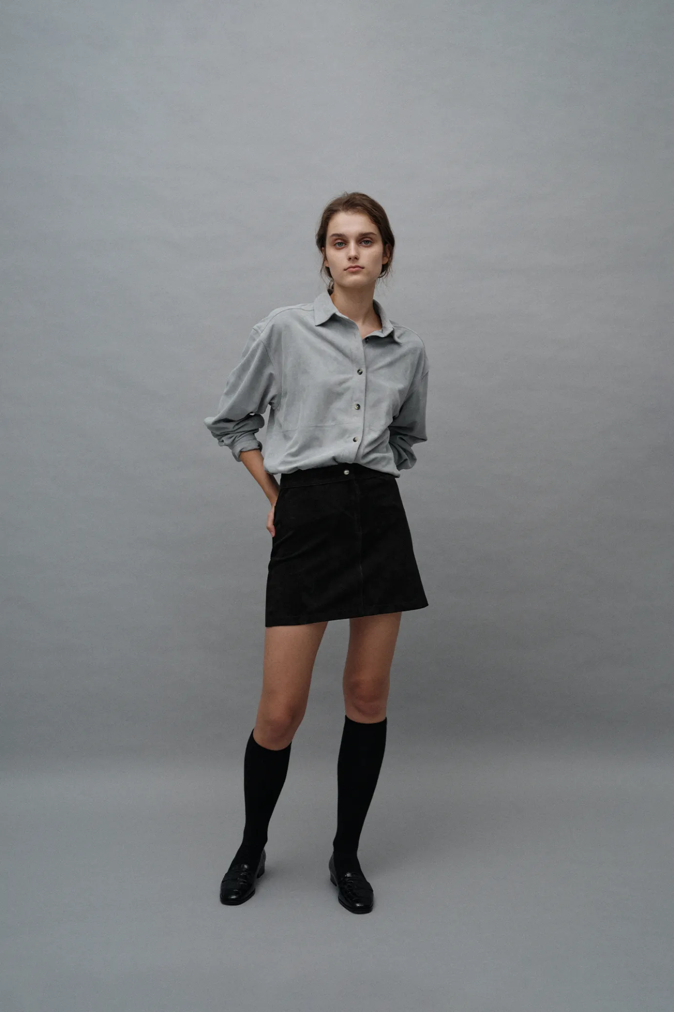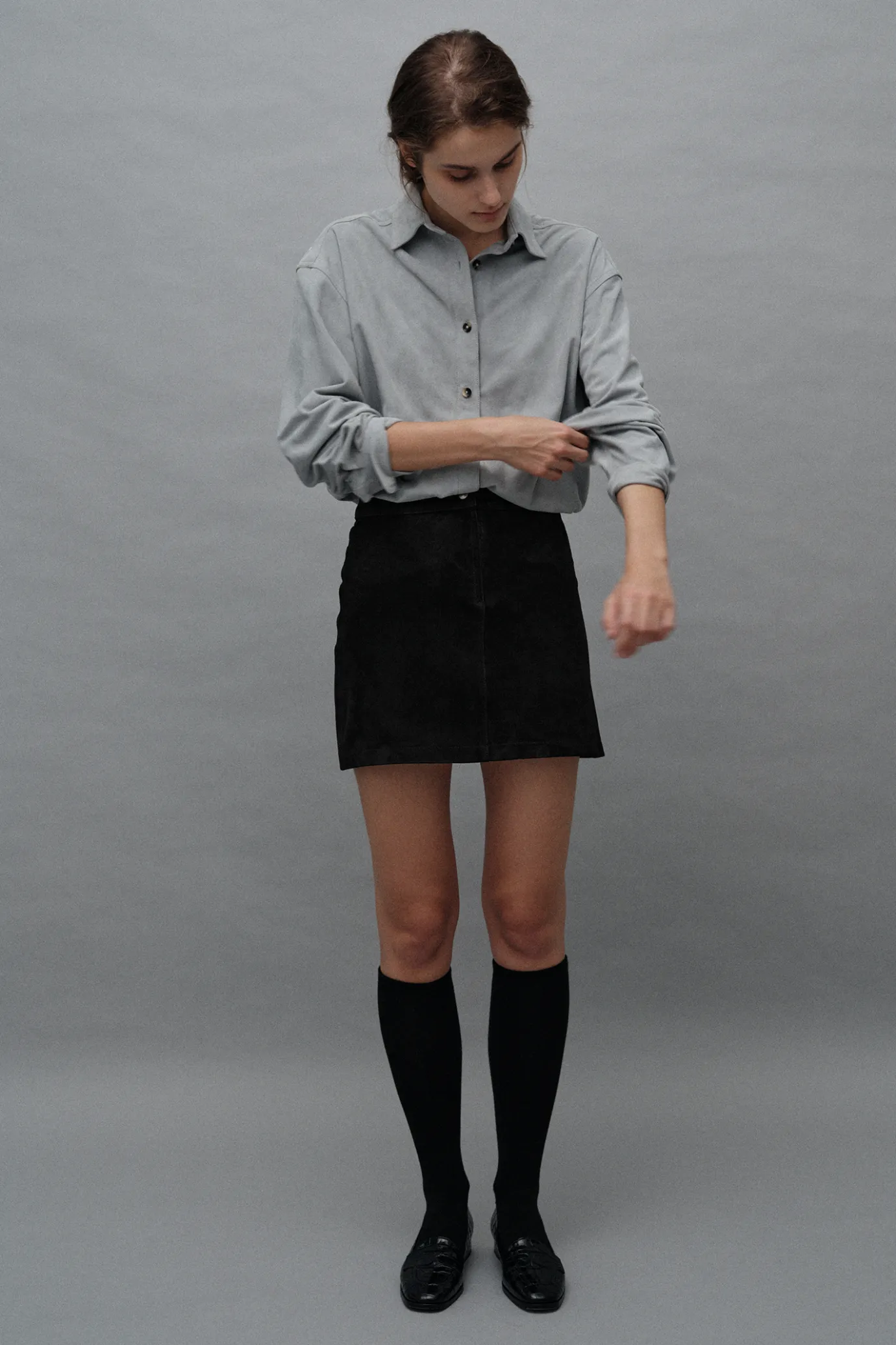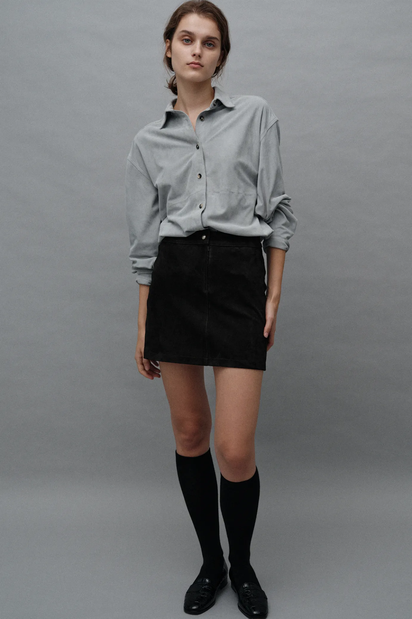 This is a suede A-LINE mini skirt with a basic design.Made from Goat skin with excellent elasticity, it provides a luxurious texture and soft touch. The naturally falling length emphasizes an elegant yet feminine mood. Due to the nature of natural leather, the characteristics of the tendons stand out, and each product shows a variety of colors and adds a unique charm.It can be paired with RONA SUEDE JACKET to create a more complete style, and the lining of the viscous mixed fabric provides a smooth and comfortable fit and adds comfort.
