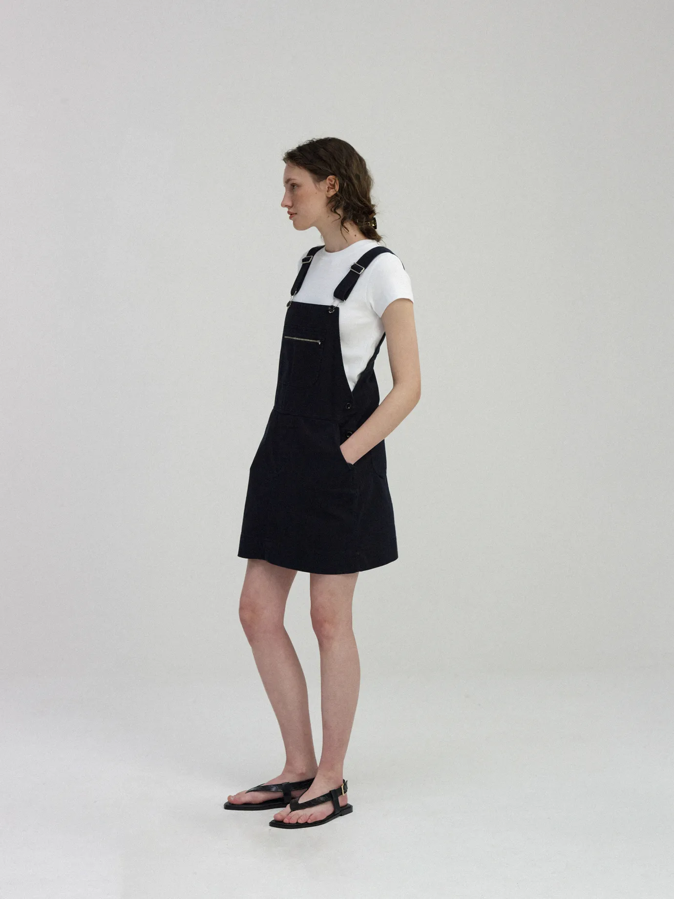 It’s a cotton overall skirt with a classic sensibility. Overall, it has a relaxed silhouette and no lining, so it feels cool to wear. A solid 16-sided twill fabric is added with bio-washing to relieve soft touch and contraction and show a vintage color. The nut buttons add casual sensibility and adjustable length with shoulder straps. The pocket structure of the zipper closure and both side pockets enhance storage and practicality, and the thick stitching is used for accentuation.