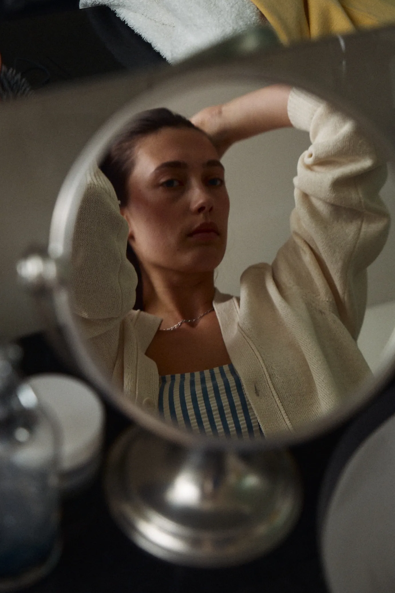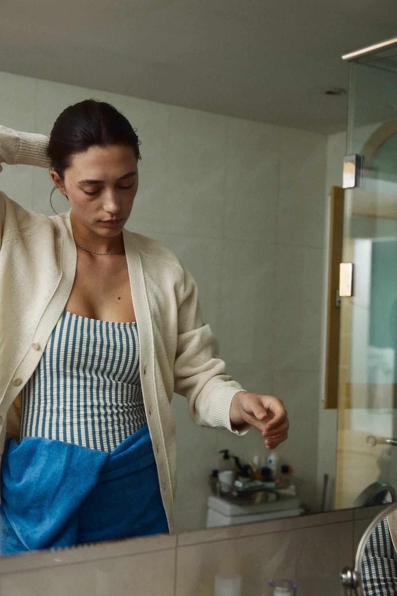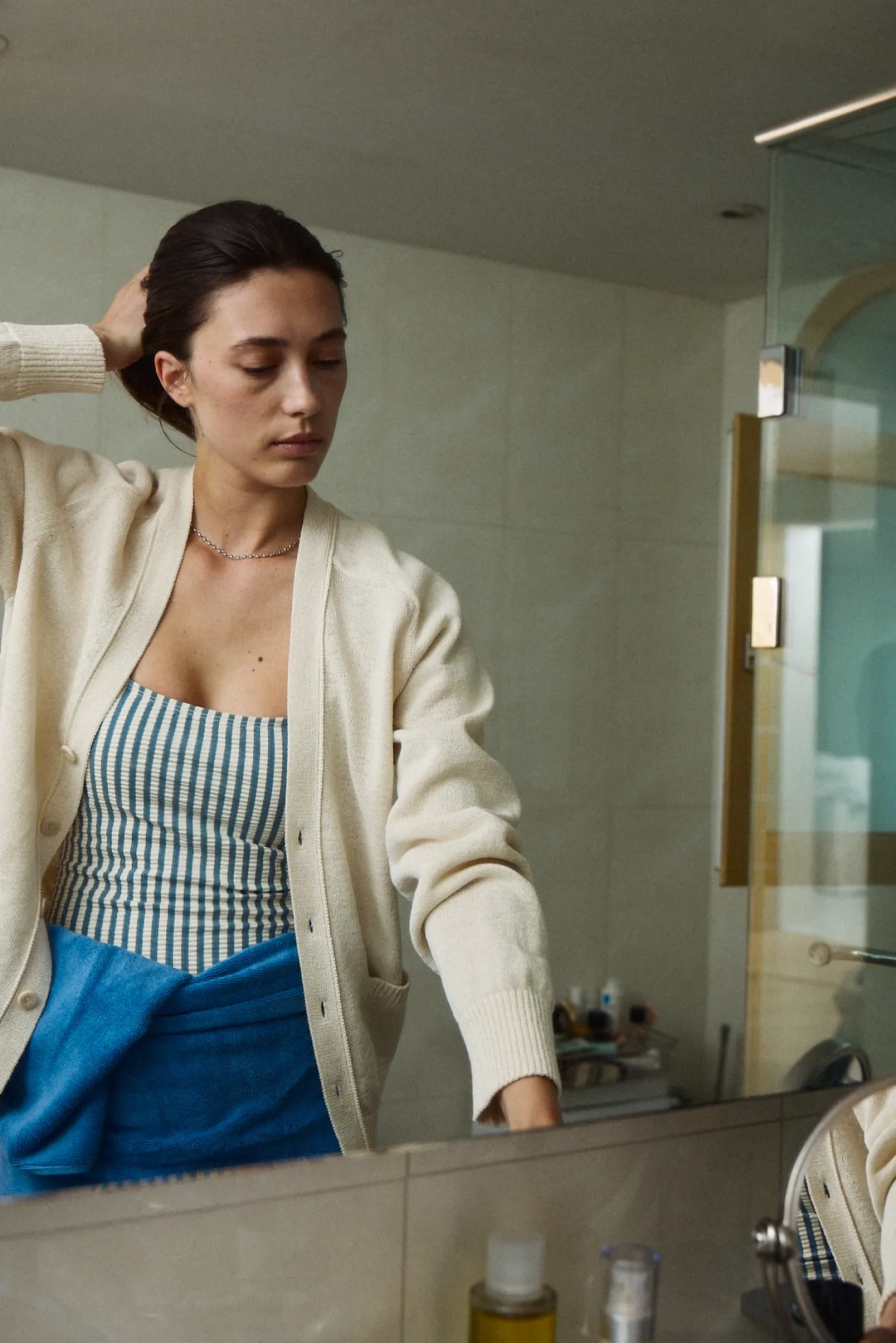 It is a swimsuit with a simple design and stripe patterns.It uses fabric from ARINOBE.CO.LTD, Japan, which specializes in natural cotton fabrics for over 50 years, for a breathable and comfortable fit. It is made of a lightweight sourker material with a fine wrinkled shape and can be worn comfortably and coolly with a soft touch.The neckline and pad that fall along the length-adjustable thin strap are added to complete a comfortable silhouette, and it is an item that can be worn comfortably and stylishly for summer water activities. A stable low-cut leg line makes it easy to wear, and a deep down back line provides a cool fit.* It has a built-in detachable chest pad.
