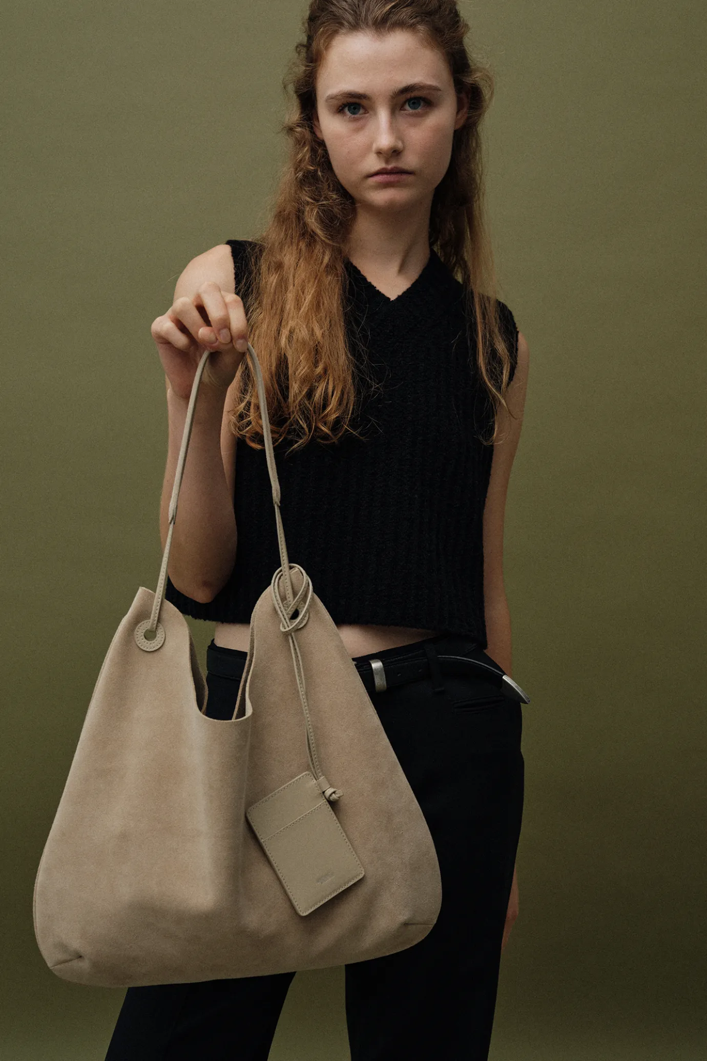 This is a suede hobo bag with a soft texture. The unique delicate texture and subtle gloss add to the sophisticated charm and create a luxurious and comfortable feeling. The lines that are naturally caught when worn create a comfortable look, and the overall curved outline design emphasizes an elegant yet soft silhouette. It comes with a card holder with two detachable card slots that satisfies both practicality and design, and it is tied to the shoulder strap so that it can be easily separated and used as needed, and it acts as a point of the bag itself. It can be easily opened and closed using the magnet lock, and it is an item that adds luxury to everyday styling.