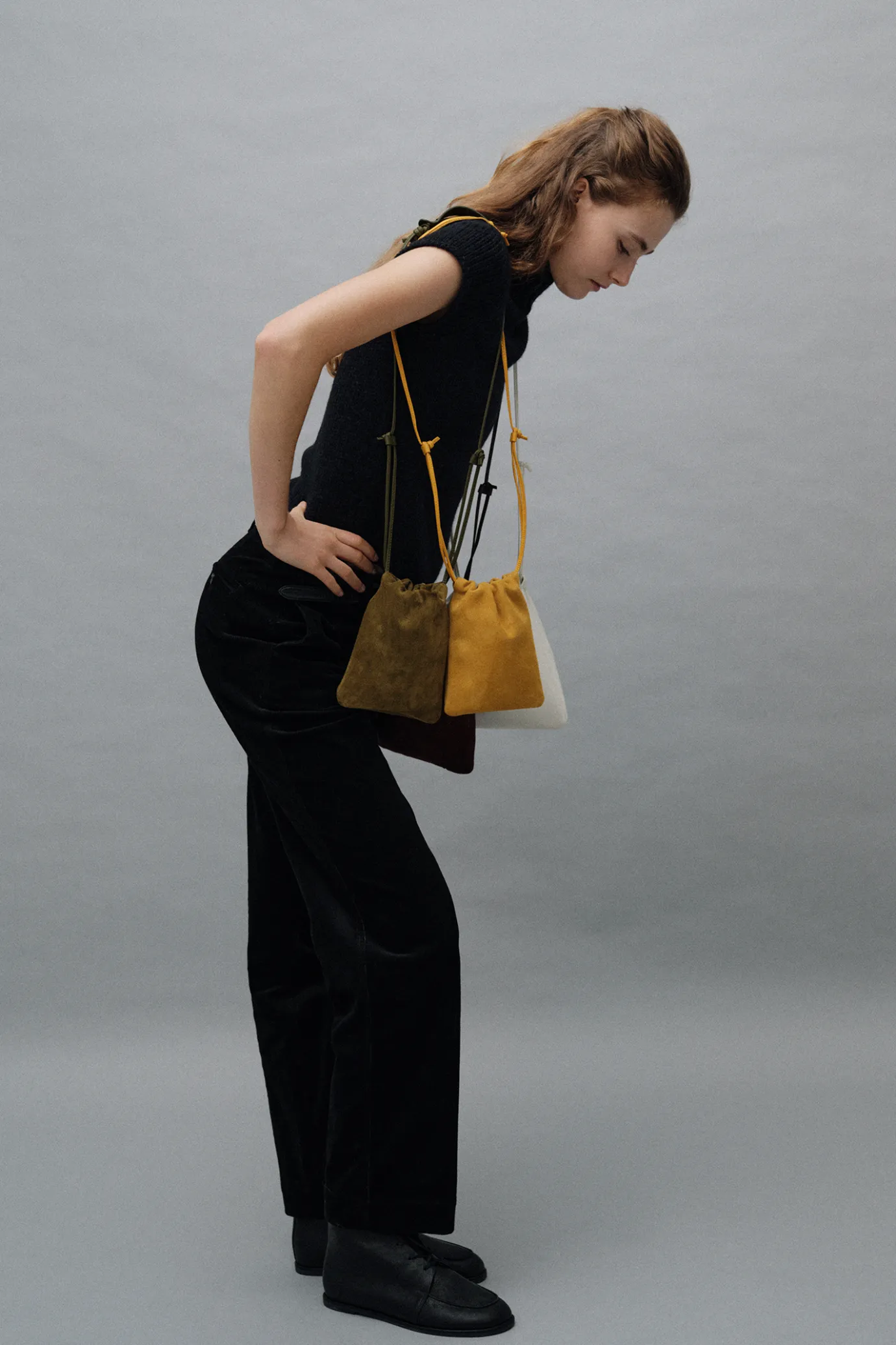 It is a mini FATU SHOLDER BAG with a minimal design. It is a practical size that can store mobile phones, but it is suitable for light outings because it can easily store essential items. It is made of ramskin material with a soft touch, making the leather tame more naturally and deeper into wrinkles and texture over time. It is a real suede material with a unique color suitable for the FW season, featuring a soft and luxurious texture, and completes a sophisticated style each time you wear it.Basically, it can be worn as a cross-back, it can be used as a tote bag with detachable straps, and boasts a versatile design. It creates natural shirring with a central design drawstring closure structure to add soft curves to the overall silhouette.