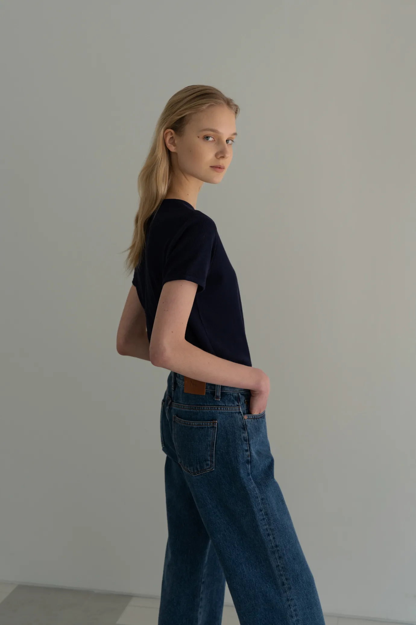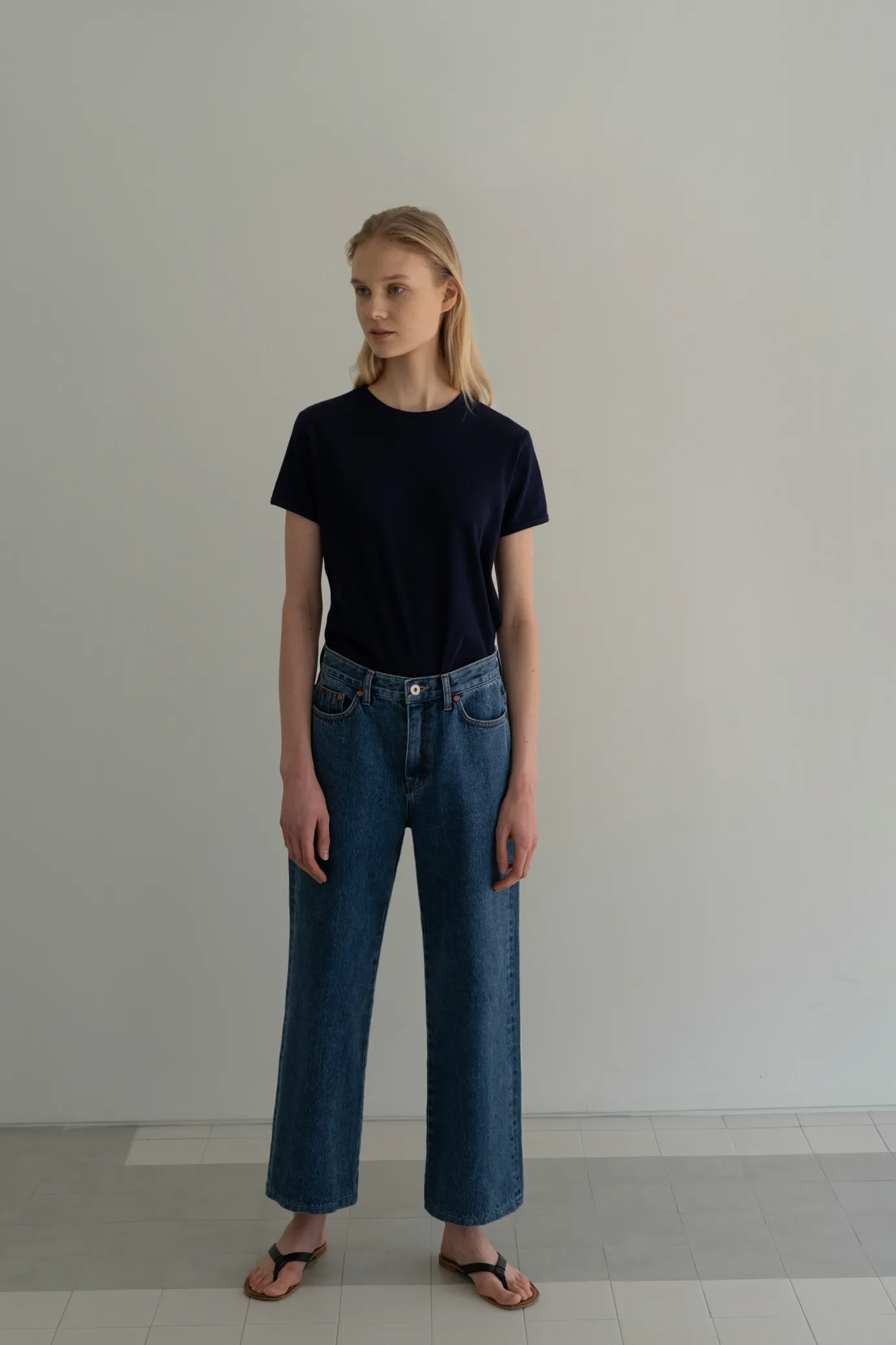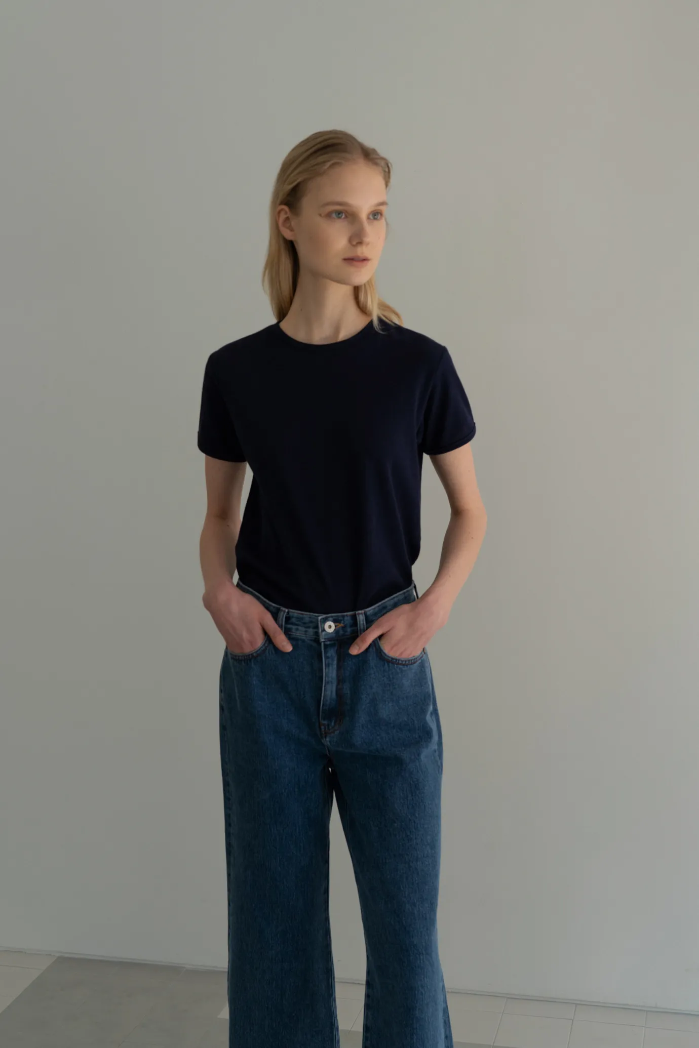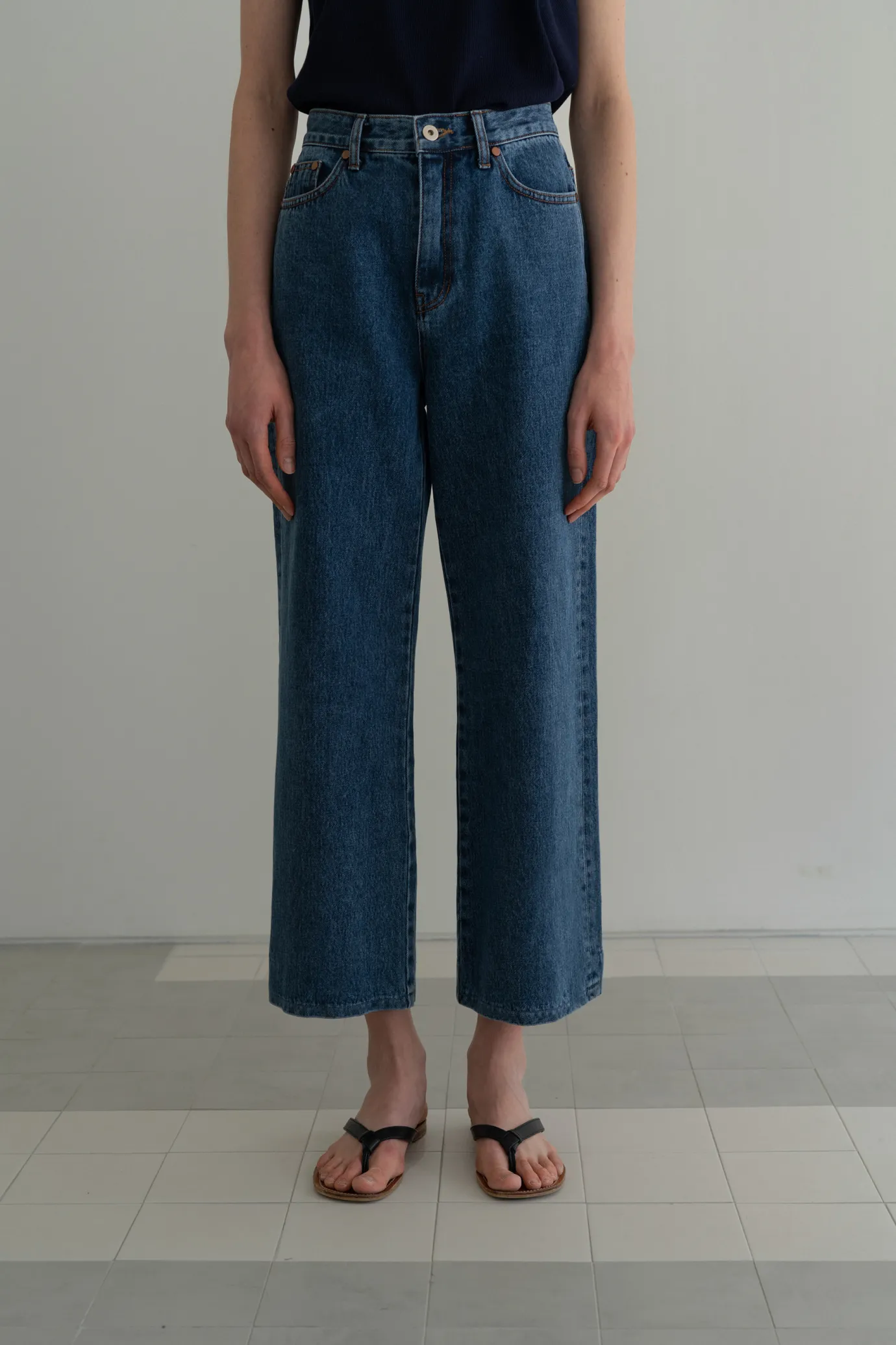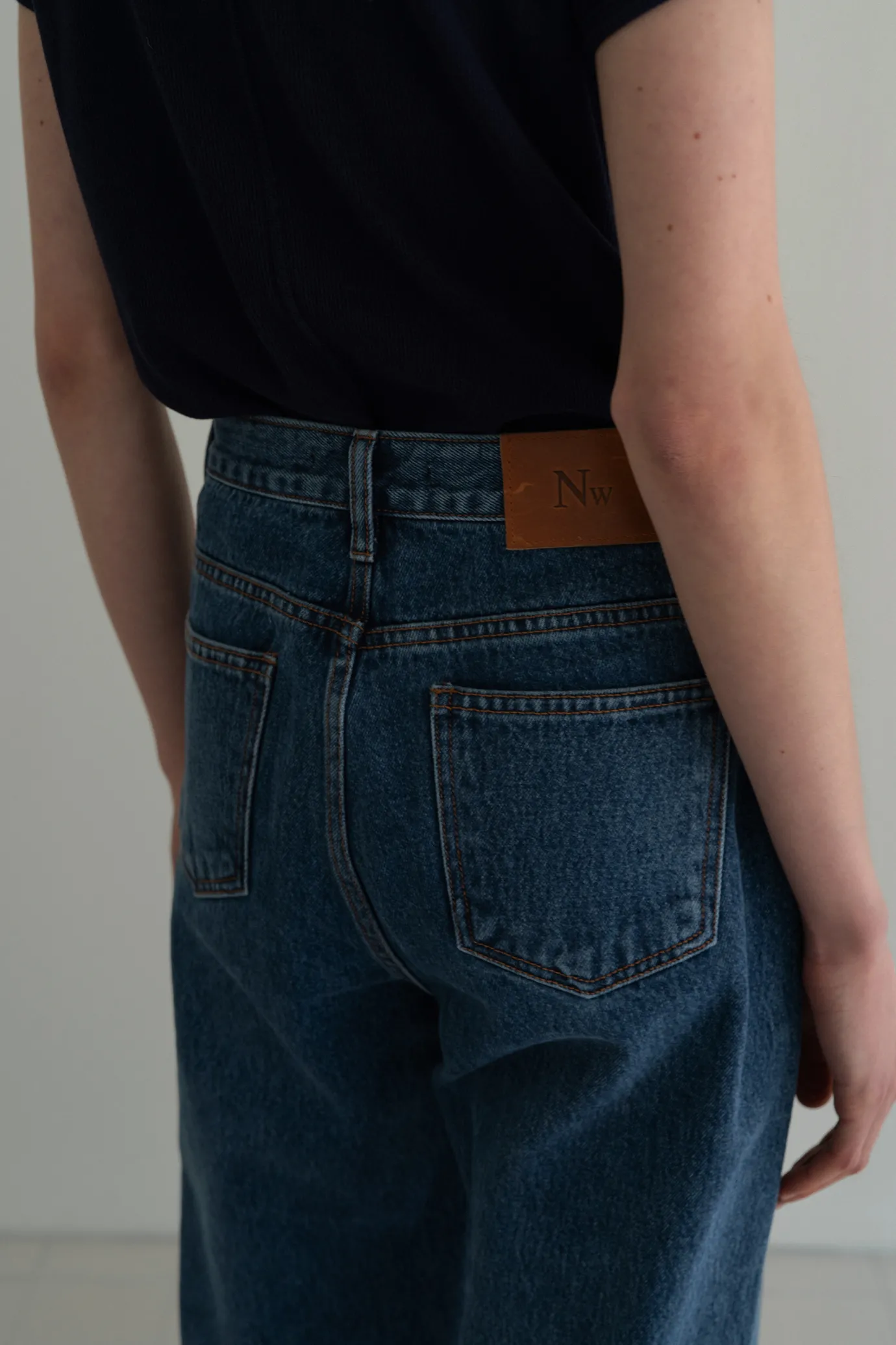 Blue jeans with a wide silhouette. Soft material with post-processing treatment. Consists of two pockets on the front and two pockets on the back. Button and zipper fly closure. Please be careful when wearing light-colored clothing. For product color, please refer to the detail cut.