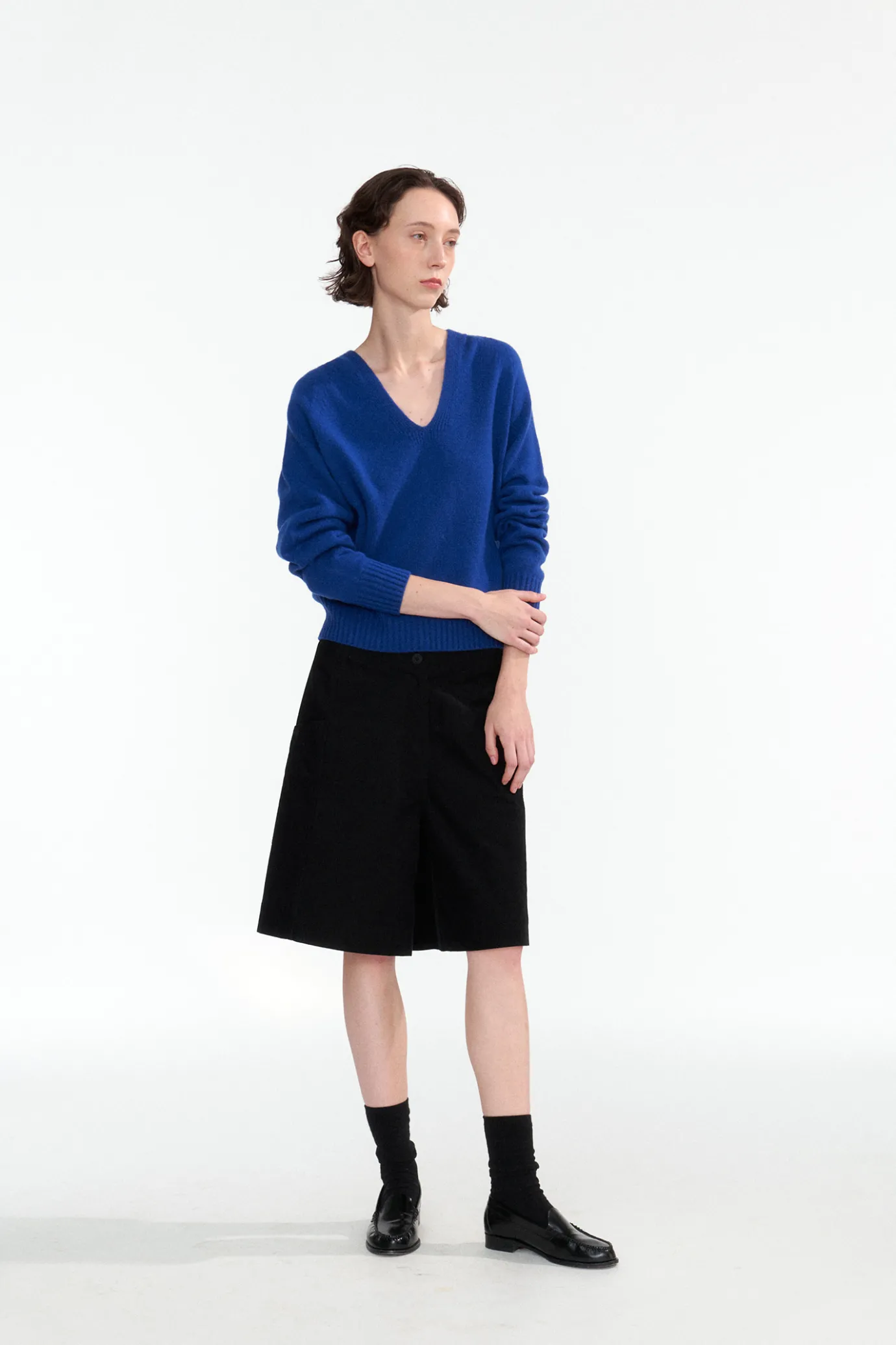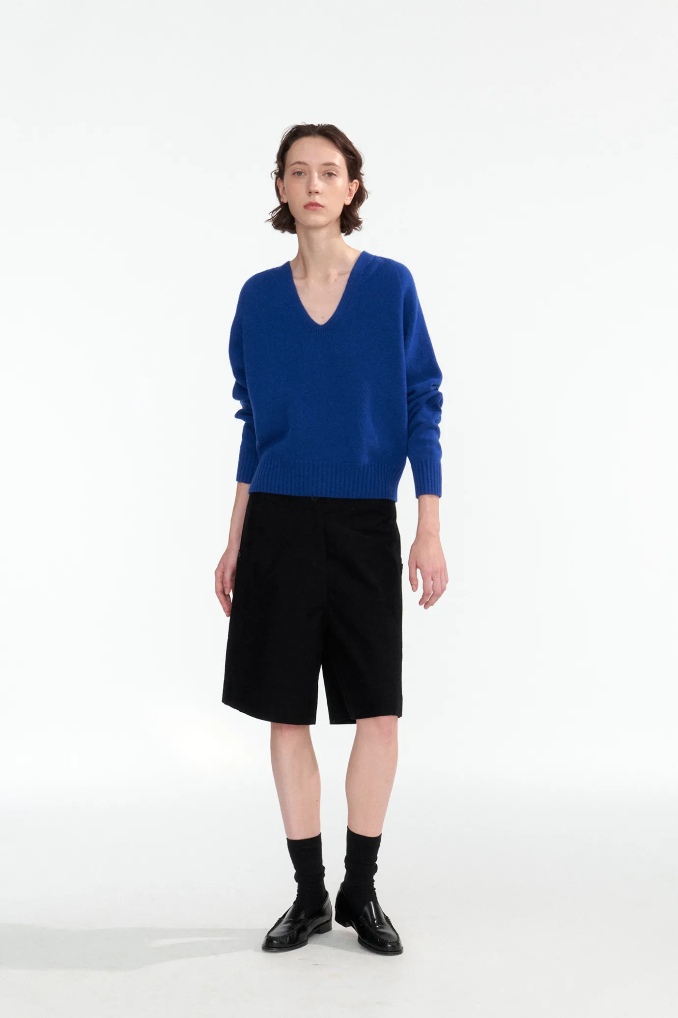 This is a basic V-NECK knit that is true to the basics. It has a generous and relaxed oversized silhouette and a wide r…