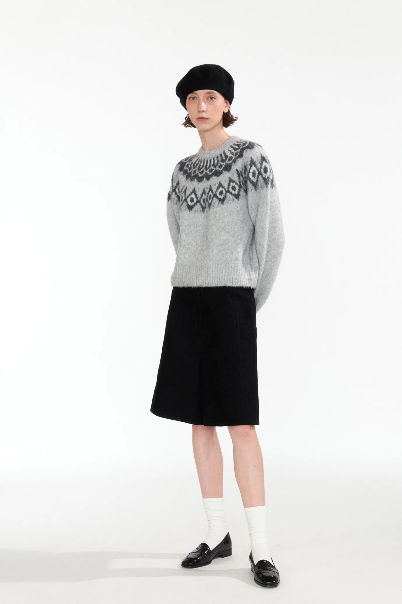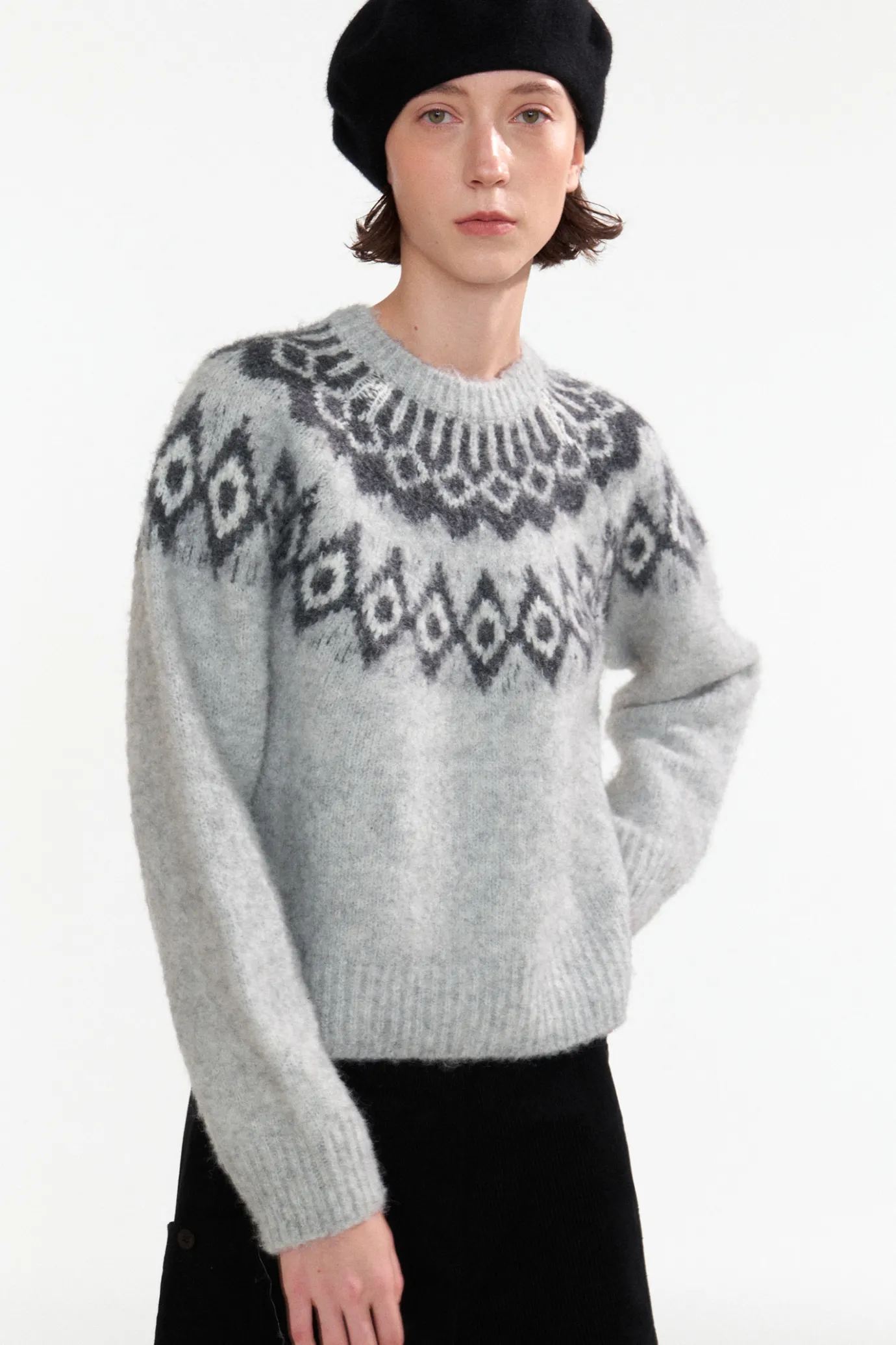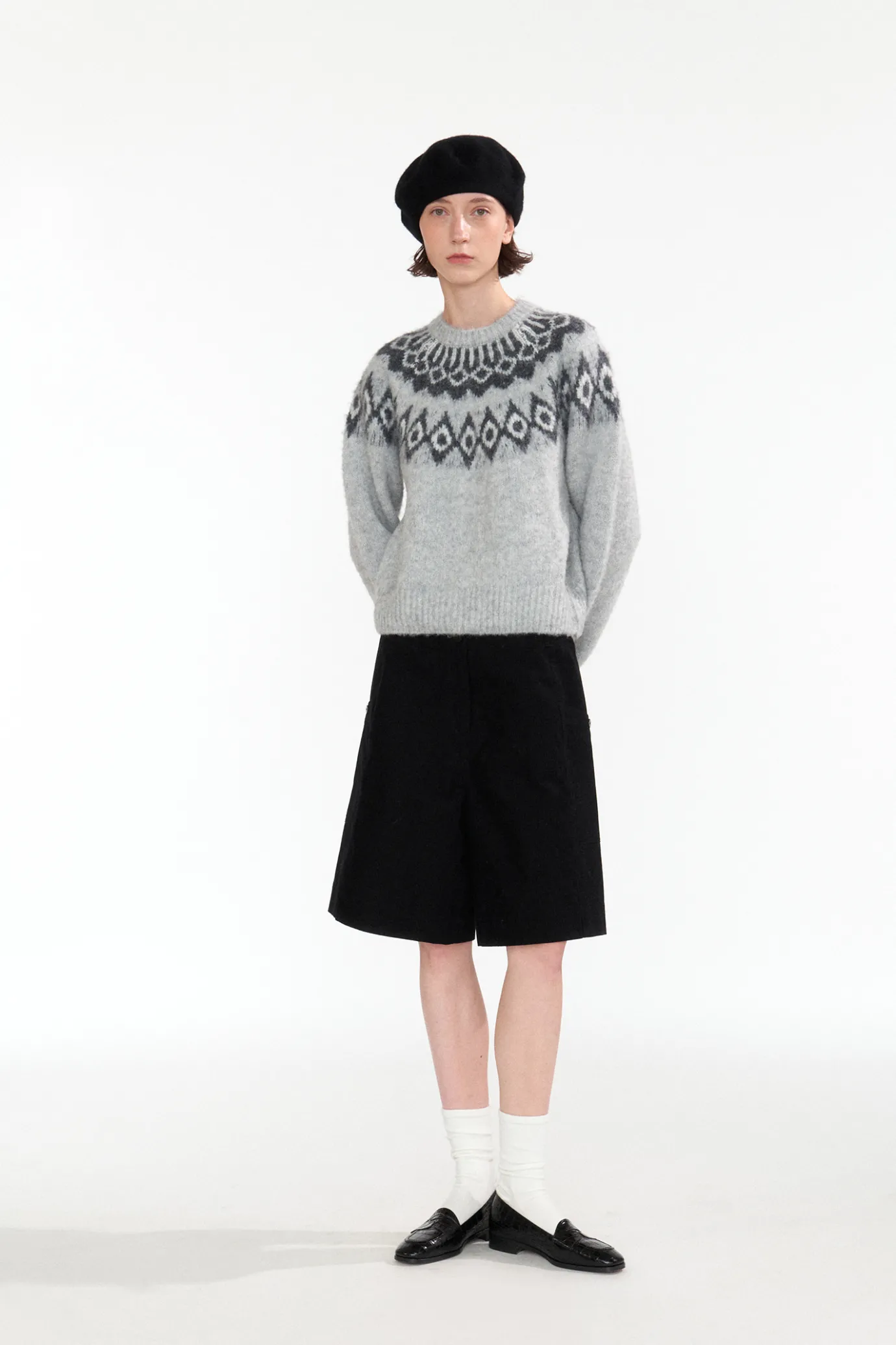 This is a basic round neck pullover knit with a Nordic pattern. The Nordic pattern is derived from the Nordic countries…