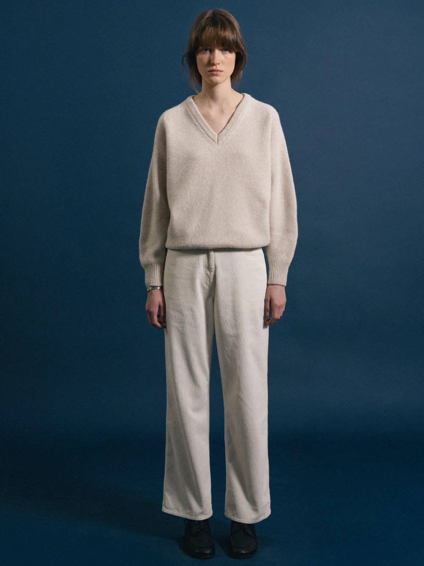 Nothing Written's signature item, the Pound V-NECK sweater, is a perfect winter essential that combines elegance and warmth. The yarn, which is a mixture of soft BABY ALPACA and WOOL, boasts excellent heat retention despite its light weight and keeps you warm in winter. The soft texture that touches the skin provides a comfortable fit and effectively maintains body temperature, making you feel cozy all day long. The moderate depth of the V-neck line gives an elegant yet sophisticated impression, and the loose silhouette is easy to match with various innerwear. The neutral fit makes it comfortable for anyone, making it the perfect choice for a daily look. The dense rib structure on the sleeves and hem minimizes deformation and emphasizes a three-dimensional silhouette, creating a more sophisticated style.