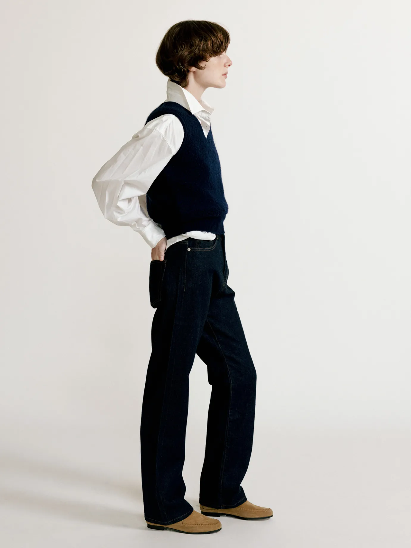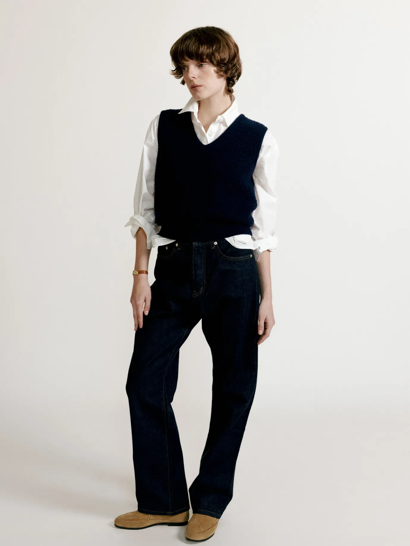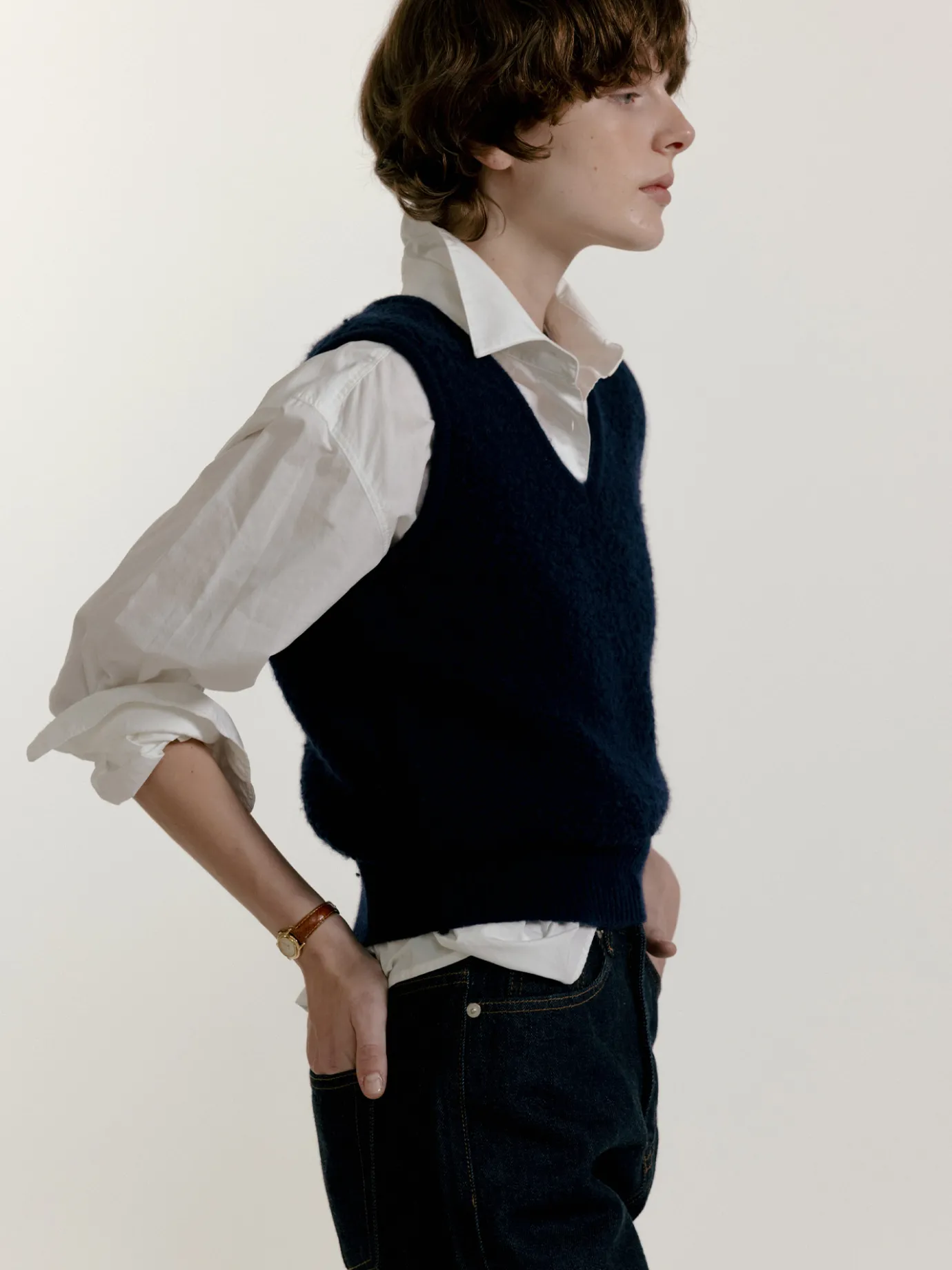 This cropped knit vest in bouclé material is perfect as a winter item. The thick wool and nylon mixed bouclé material provides excellent heat retention and presents a rich texture and voluminous design. The three-dimensional texture and soft touch that are characteristic of bouclé material stand out, conveying a warm yet luxurious feeling, and although it is a basic design, the material itself is a point, so it can be used in various styles. The cropped length adds a refreshing atmosphere, and you can create a longer and slimmer silhouette by matching it with high-waisted pants or skirts. The thick hem and ribbed texture of the sleeves increase the durability of the knit and provide a comfortable yet stable fit. It boasts excellent usability as a layered item, and when styled with warm innerwear, it is a great daily item in winter.