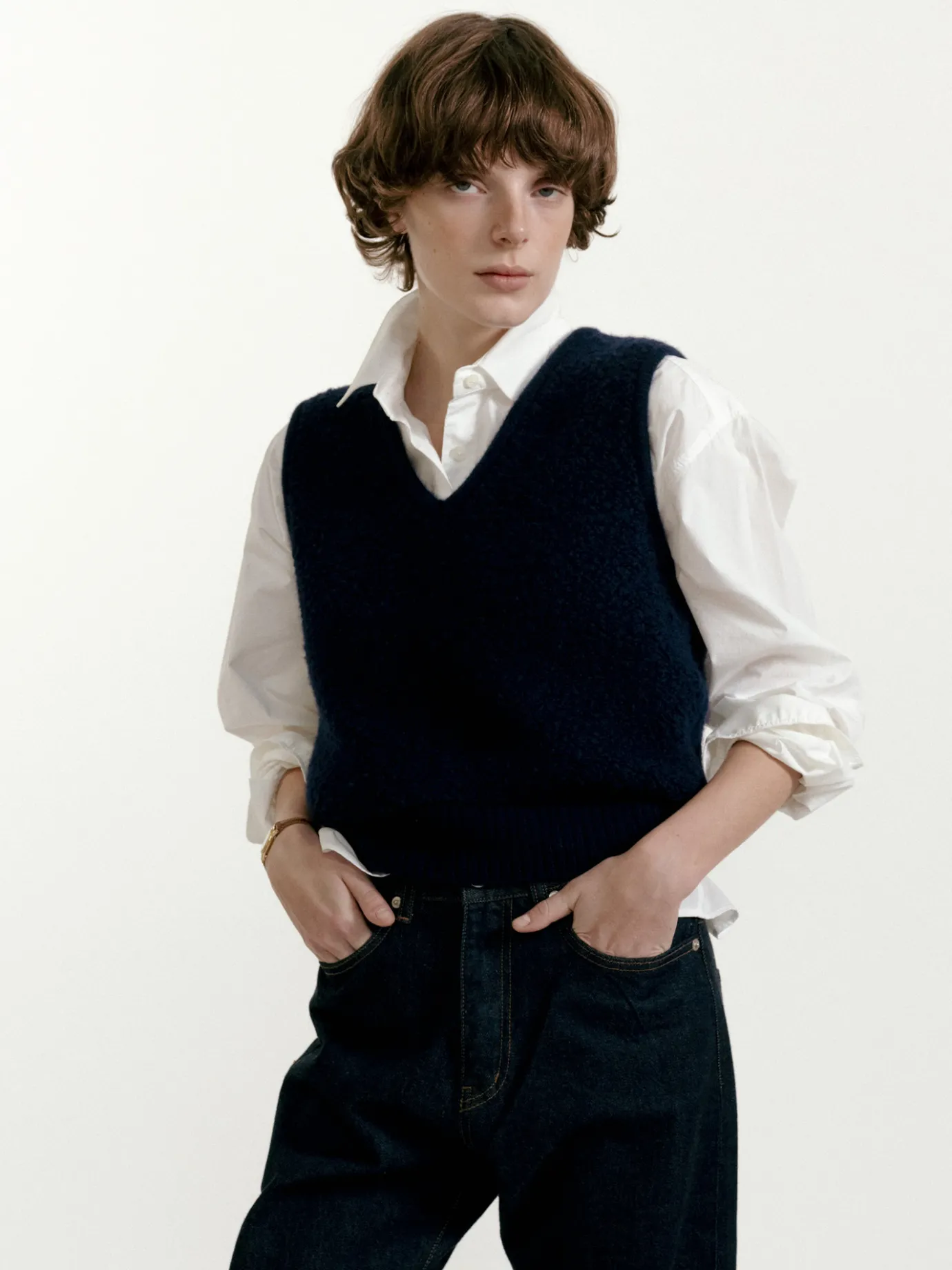 This cropped knit vest in bouclé material is perfect as a winter item. The thick wool and nylon mixed bouclé material…