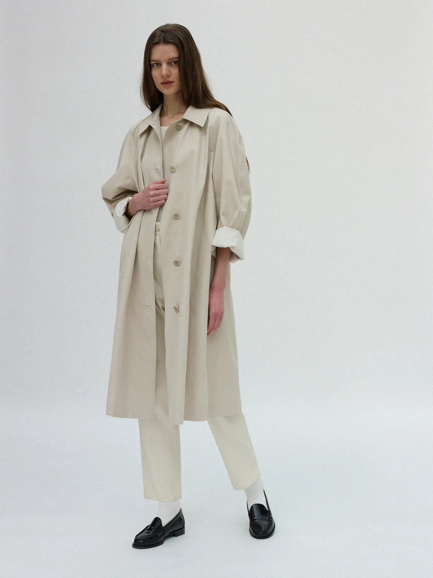 An oversized single trench coat with an attractive voluminous shoulder. Made of 100% gabardine COTTON material with a natural texture and solidity, it is composed of 29 high-density twill tissues and is a good item to wear lightly during the change of seasons. It boasts comfortable activity with a deep back slit and features five big-sized glossy buttons and high-end sewing details with the Natting Litton logo imprinted on them. It consists of both side welt pockets on the front and the lining is made of thin and soft cotton fabric.