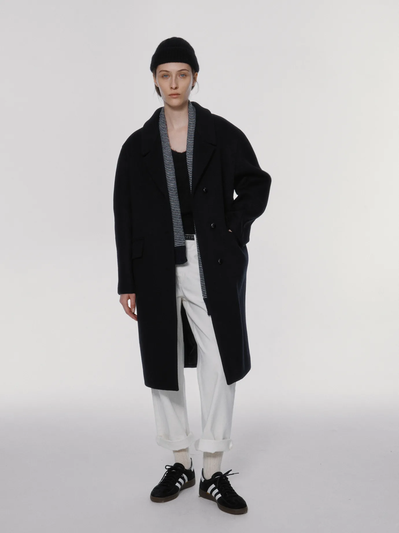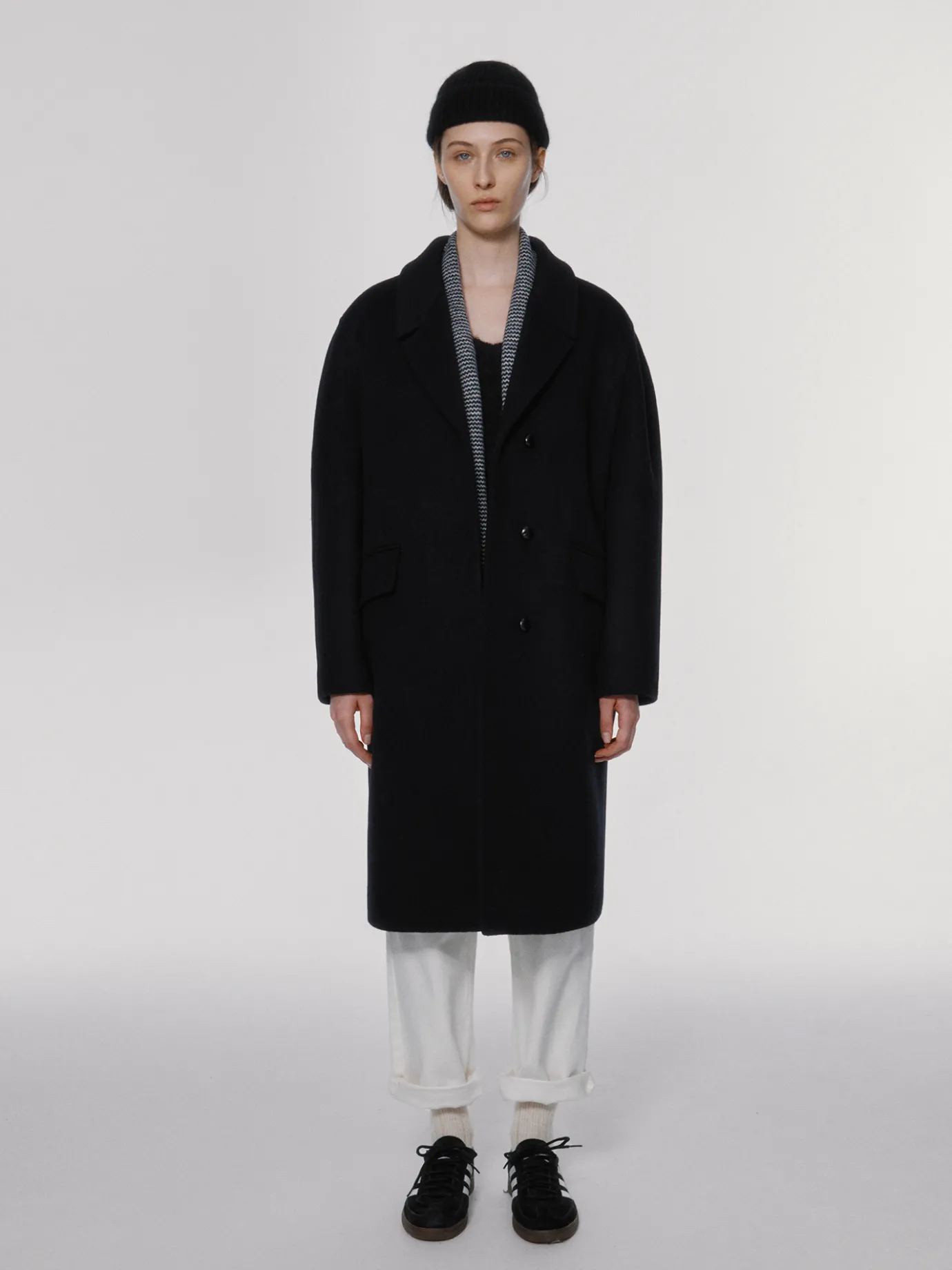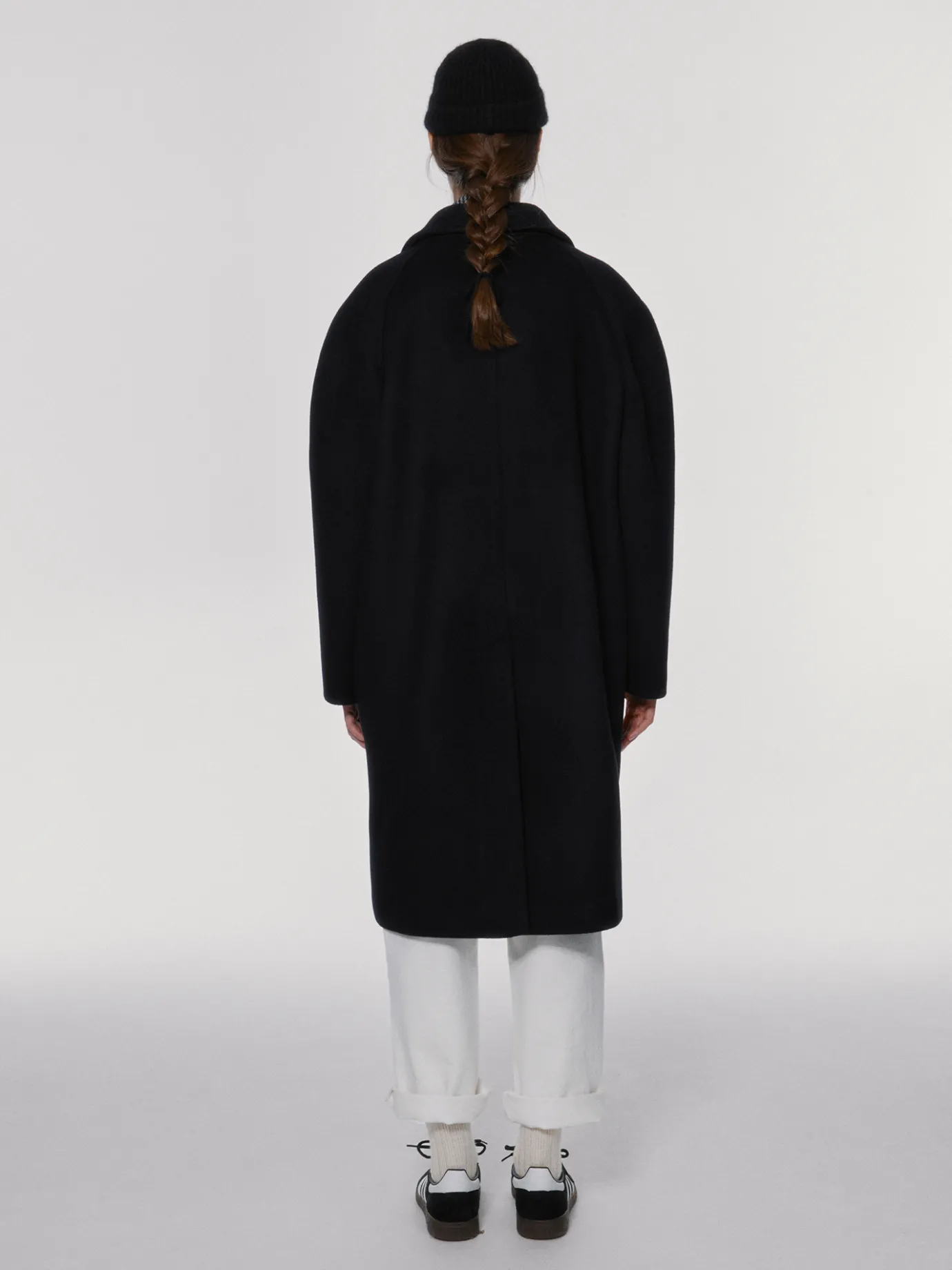 This is a classic black single coat with a comfortable shape that is easy to match with anything. It is made of 100% lambswool that is lightweight and warm even in cold weather, and has a soft texture. The lining is a viscose blend material with a luxurious sheen. It features a star stitch detail added to the entire finish and a back slit detail, and a clean silhouette along the oversized drop shoulder. It features a drop shoulder, welt pockets on both sides of the waistline, and buttons made by twisting real leather on the front.