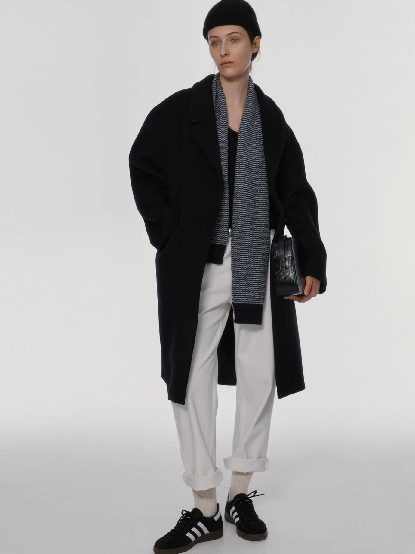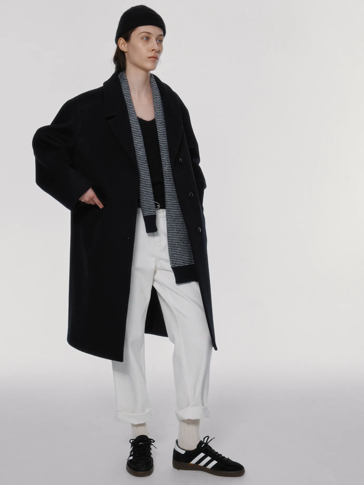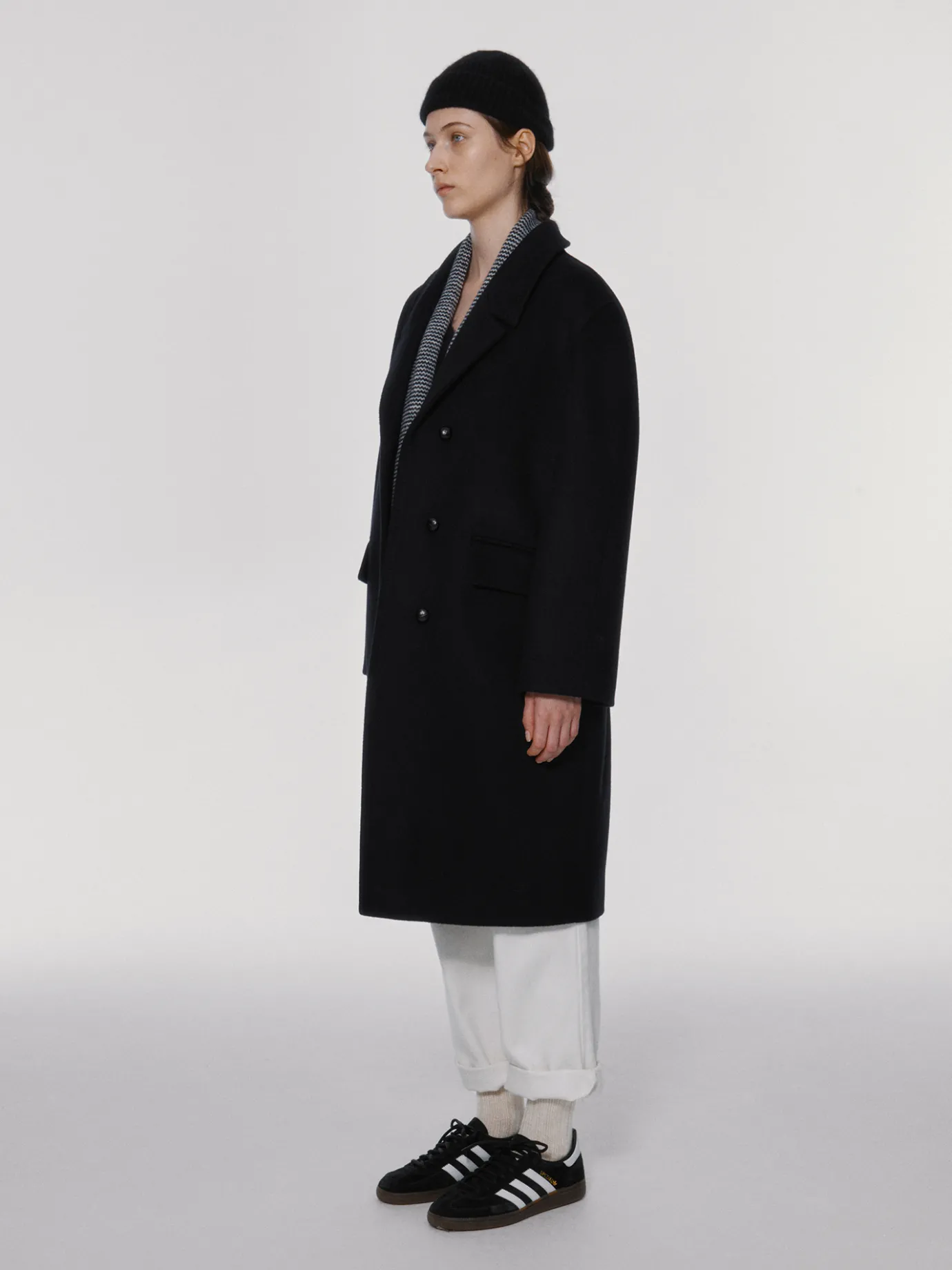 This is a classic black single coat with a comfortable shape that is easy to match with anything. It is made of 100% lambswool that is lightweight and warm even in cold weather, and has a soft texture. The lining is a viscose blend material with a luxurious sheen. It features a star stitch detail added to the entire finish and a back slit detail, and a clean silhouette along the oversized drop shoulder. It features a drop shoulder, welt pockets on both sides of the waistline, and buttons made by twisting real leather on the front.