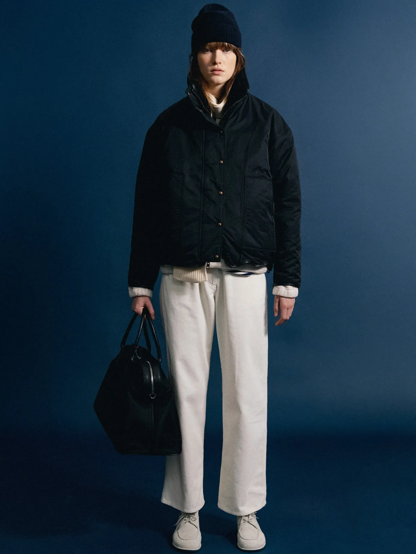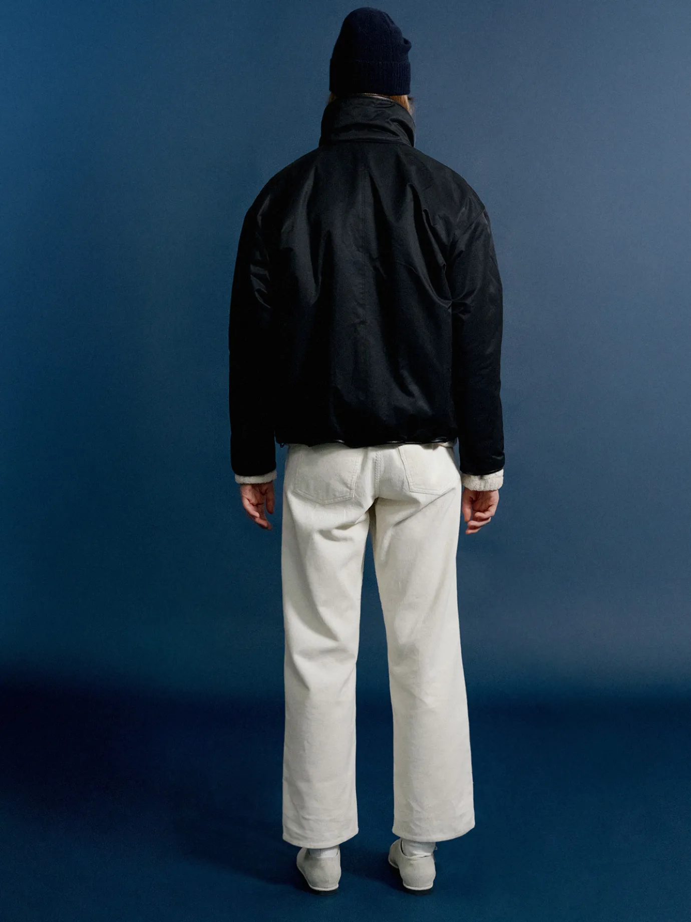 This reversible jumper is made of a strong and durable cotton and nylon blend with a warm and soft faux shearling. The reversible design allows you to use both sides, and the stand collar effectively blocks the cold wind and the loose silhouette provide a comfortable fit. The delicate and sturdy bias finish further enhances the quality of the product, and the double closure structure consisting of a YKK 2WAY zipper and snap button provides both durability and convenience. The spacious outer pockets on both sides make it easy to store your belongings and add practicality. The stopper and string details located on both sides of the bottom of the inside allow you to adjust the silhouette to suit your body type and style, allowing you to create a variety of styles from a casual look to a formal look. The reversible structure allows you to freely choose between two designs, allowing you to enjoy both a neat and cozy look.