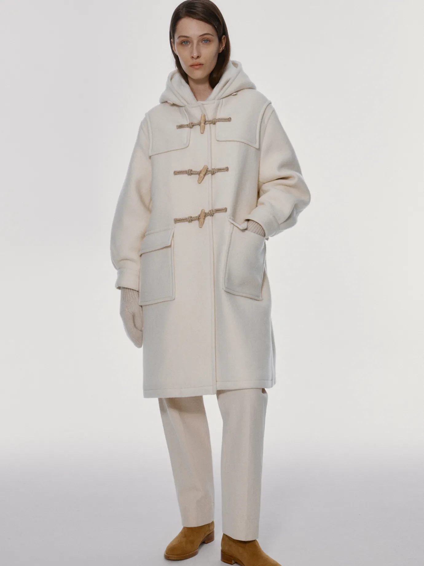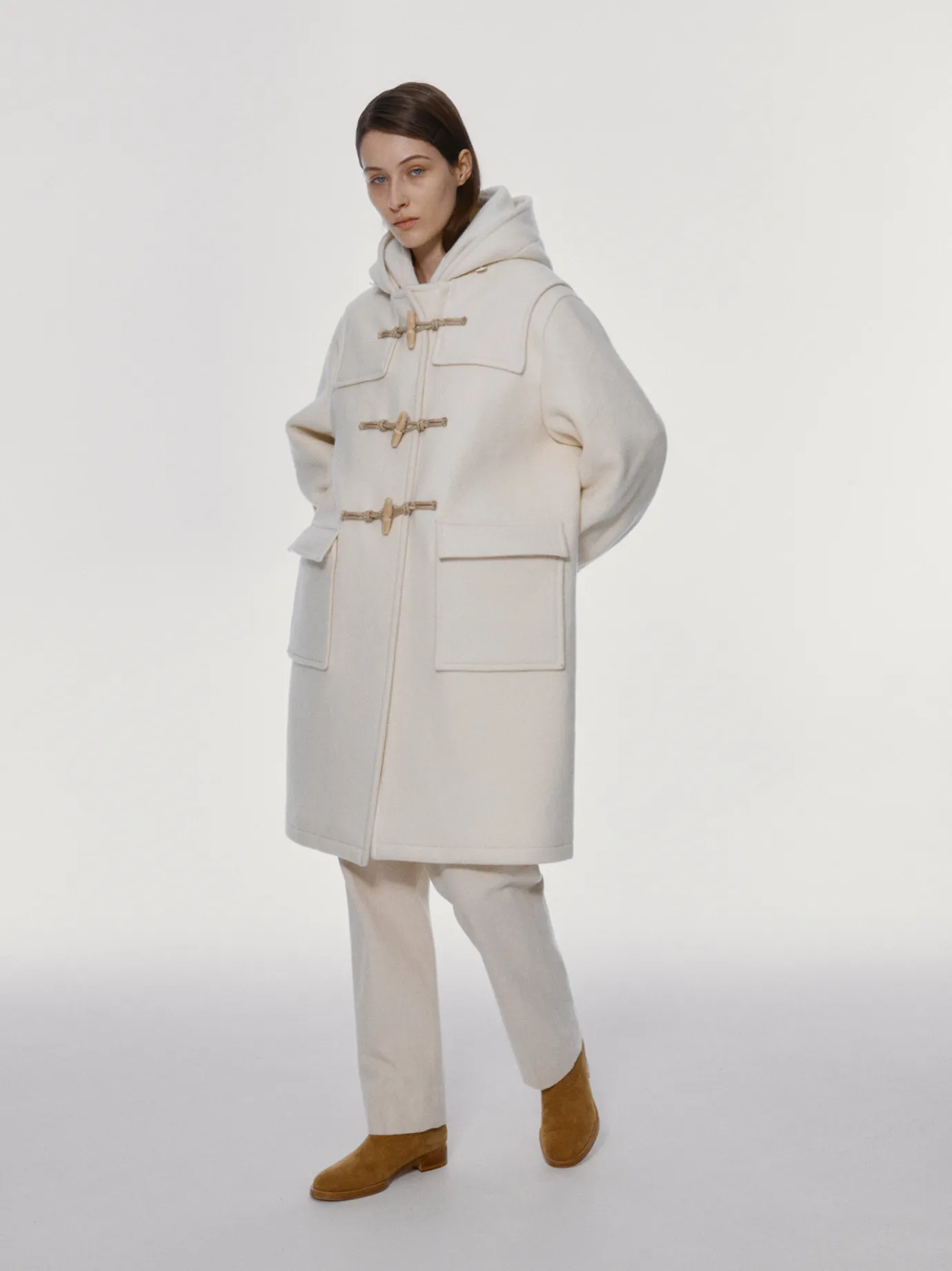 This is a hooded duffel coat with a classic oversized silhouette. It provides a stable fit and casual mood with a relaxed size and a concise design. It is a material with a combination of wool and nylon that boasts excellent warmth, feels thick, and stands out for its brushed hair with a peeling-processed fabric. The hood and collar neck panel structure and the sleeve line that falls in round shape are wide with pin jaw details to enhance volume and prevent body temperature loss from the cold wind in winter. Logo-emblazoned wooden toggle and string ring 3 closing structures, drop shoulder and out pocket design, and 1 button structure with sleeve logo.