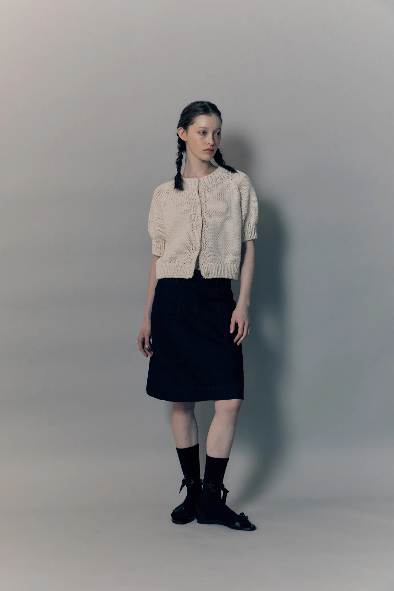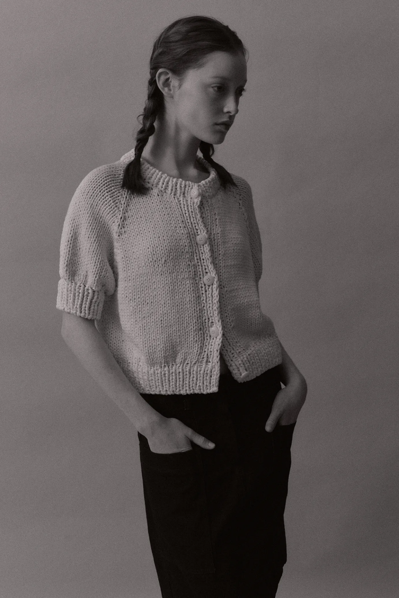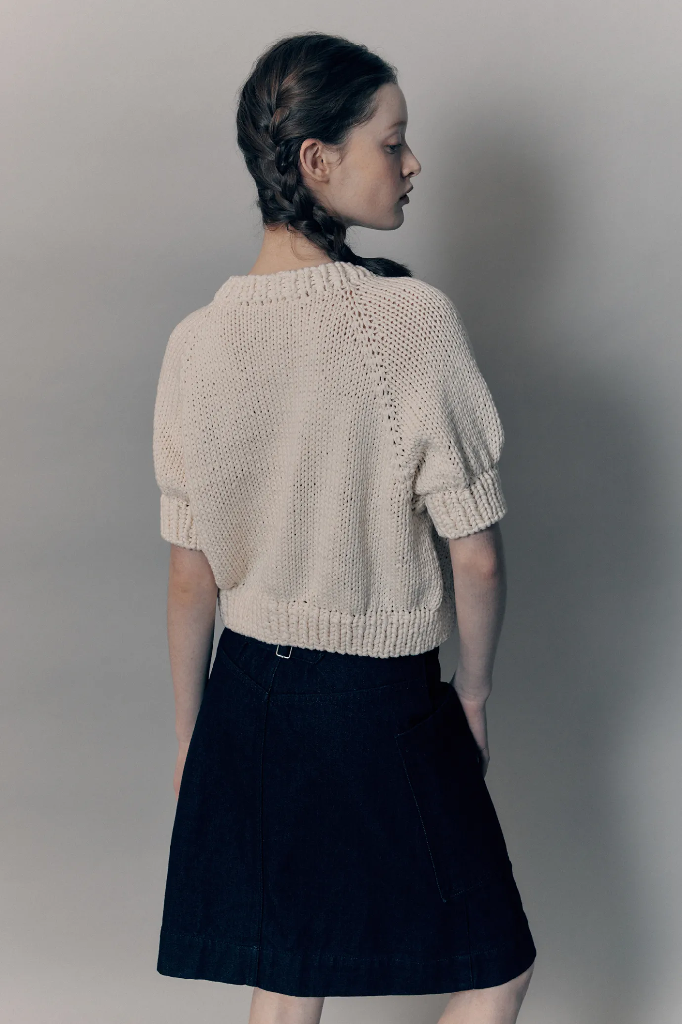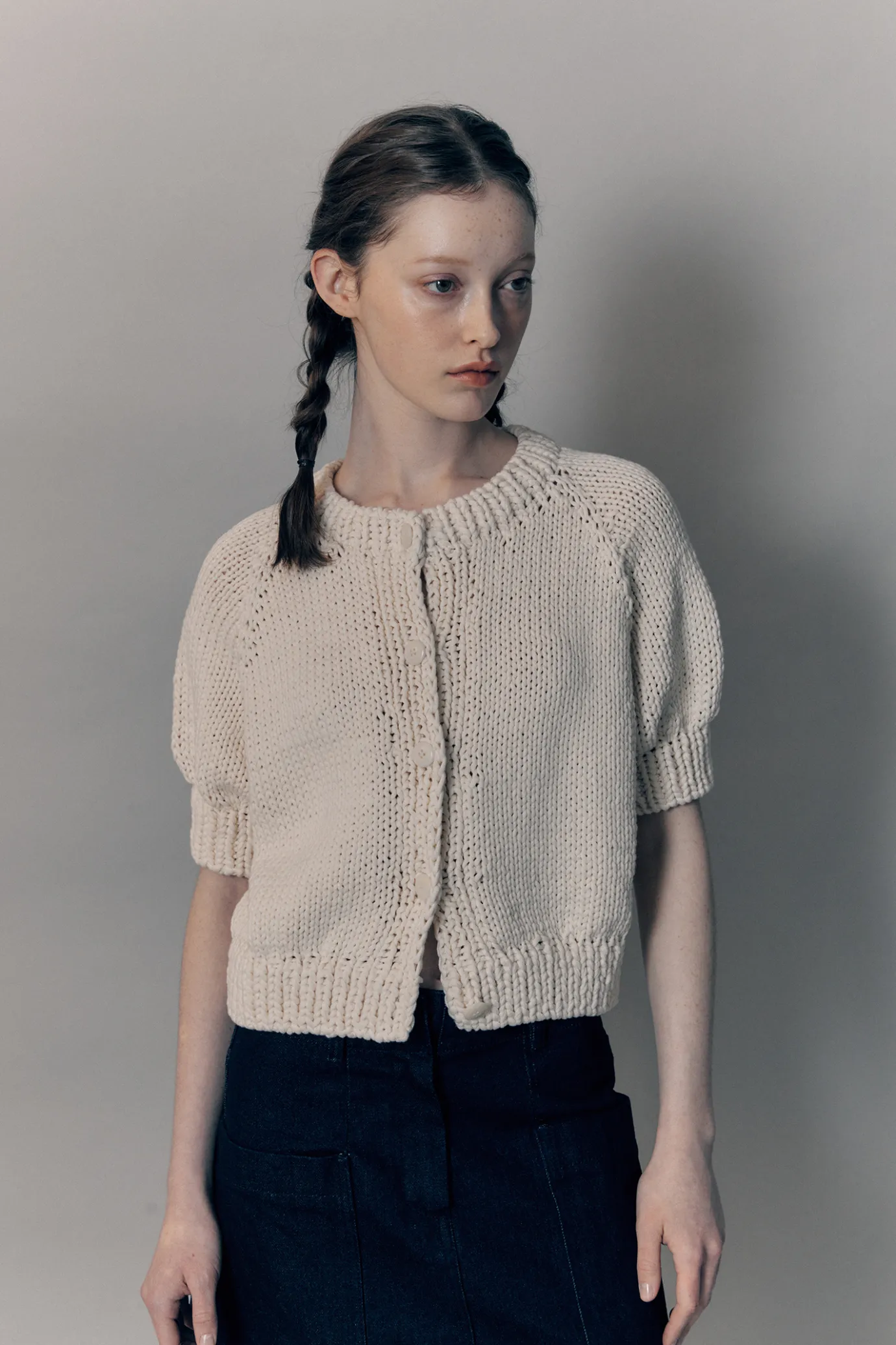 This is a 100% handmade knit cardigan.It is woven with a needle of more than 8mm to create a thick and thick shape. The neckline, sleeves, and hem are woven in two layers to create a voluminous silhouette.It is a raw color that has not undergone much dyeing process, and it may have a natural dot pattern, and it falls off naturally as you wash it.It features a raglan sleeve design with a cropped length and has a front 5 button adjustment structure.