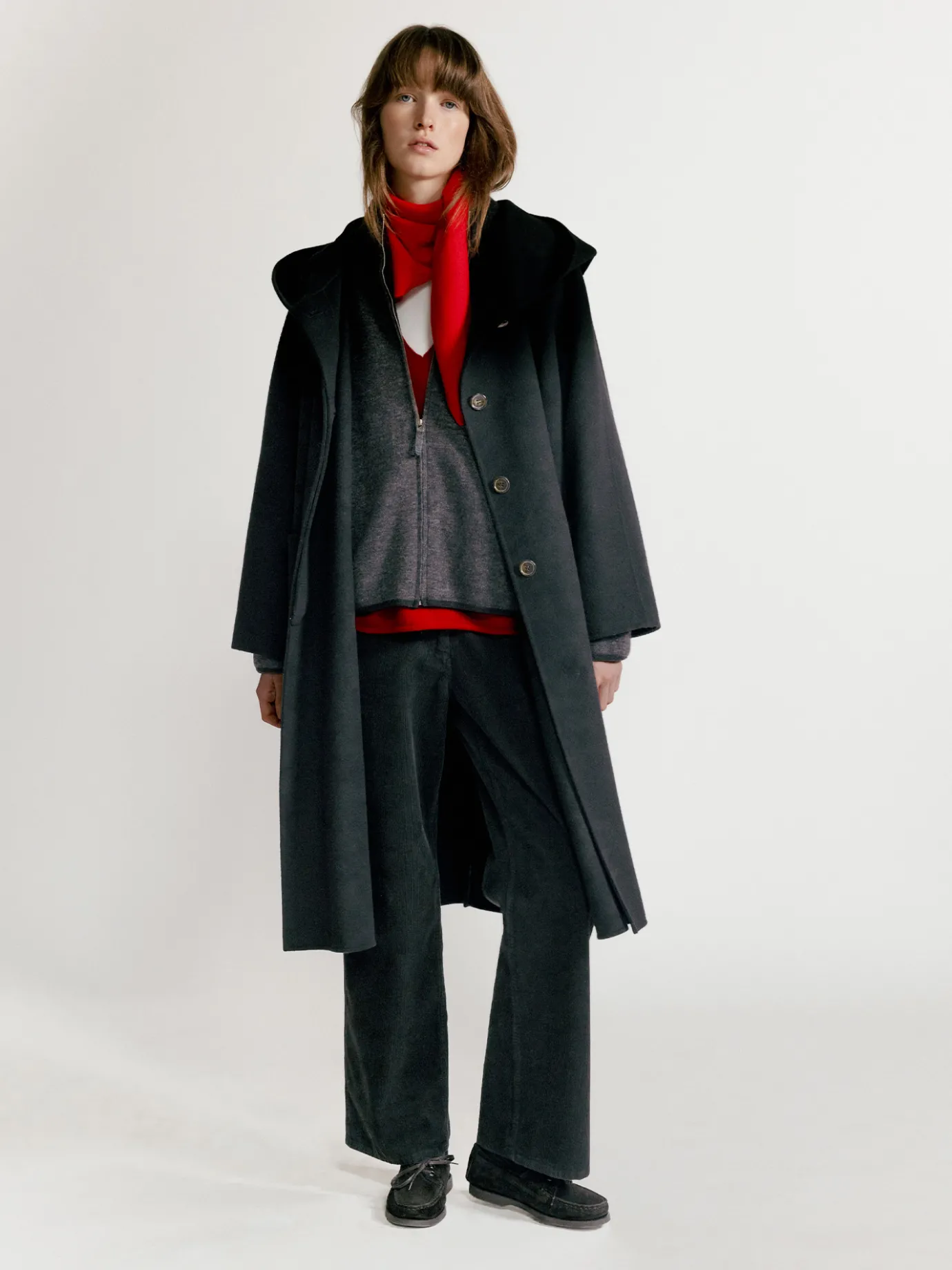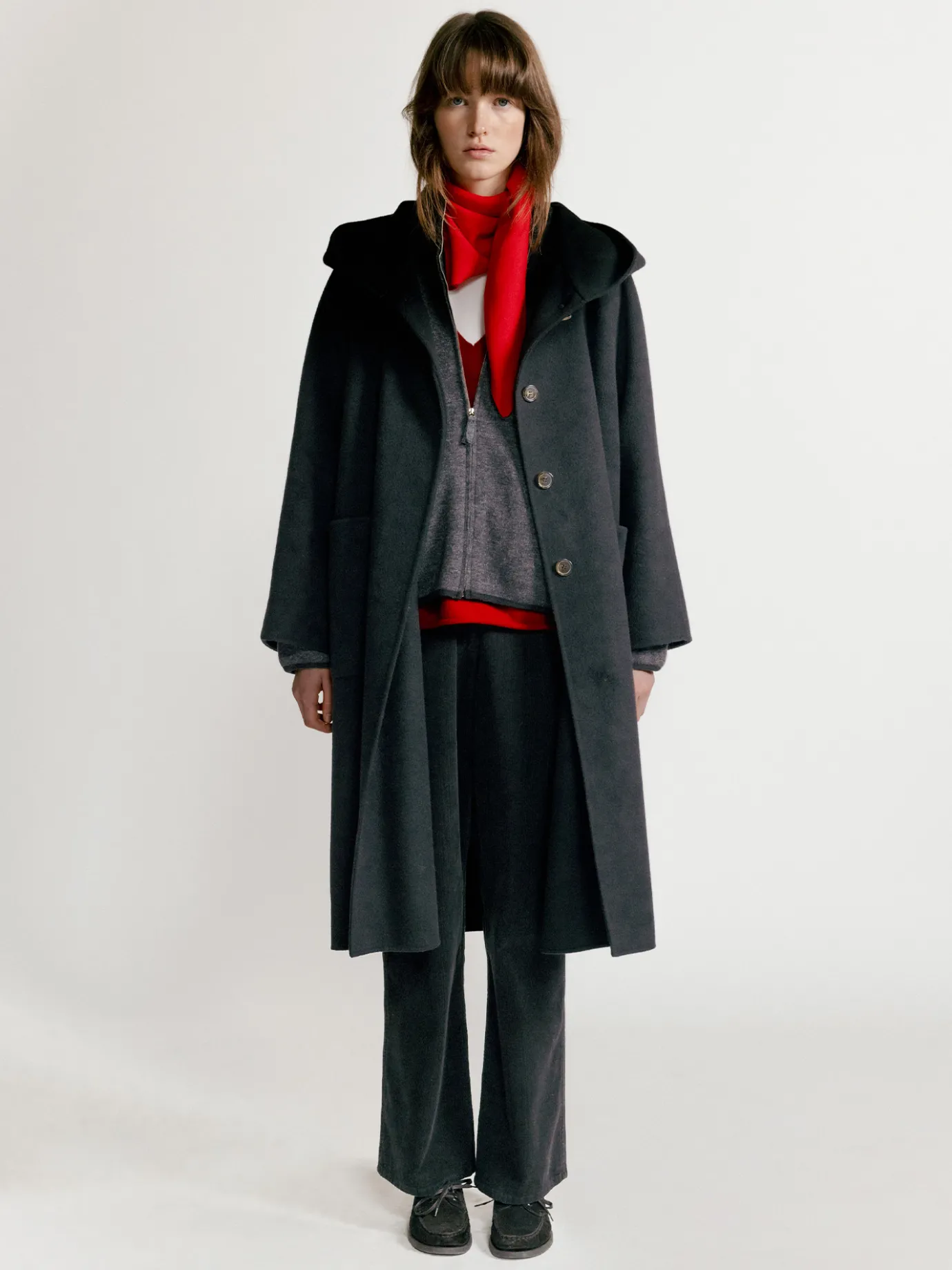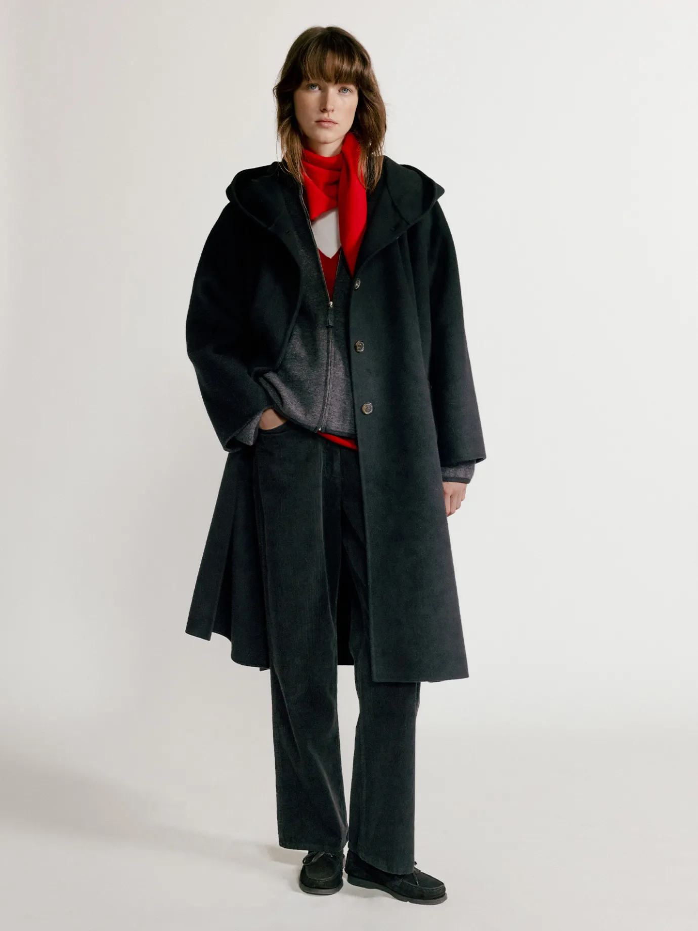The loose-fitting hooded coat is an attractive item that combines comfort and style. The loose fit and soft touch of 100% lambswool material create a natural line and can be worn comfortably by anyone regardless of body type. The wide hood detail not only adds practicality, but also emphasizes the casual atmosphere and keeps you warm even in cold weather. The ample silhouette and quilted lining using 3M Thinsulate filling minimize weight while maintaining warmth even in winter, providing a comfortable fit. The rounded raglan sleeve design creates a simple yet sophisticated mood, and the practical outer pockets on both sides and the four-button fastening structure add an elegant style without losing everyday convenience.