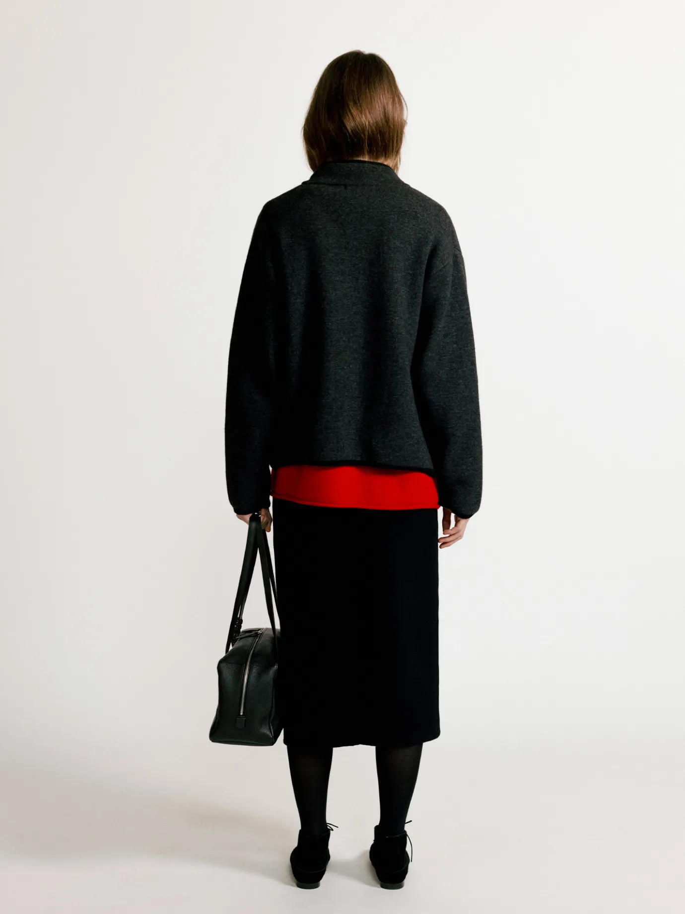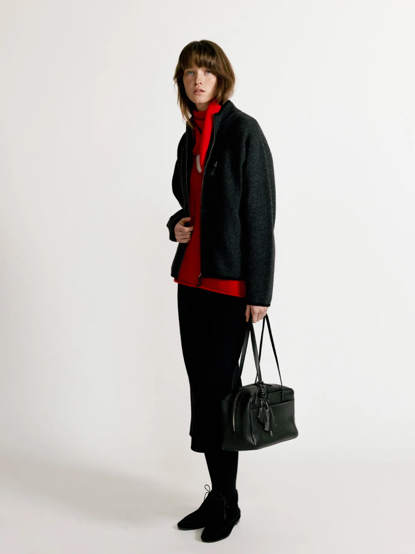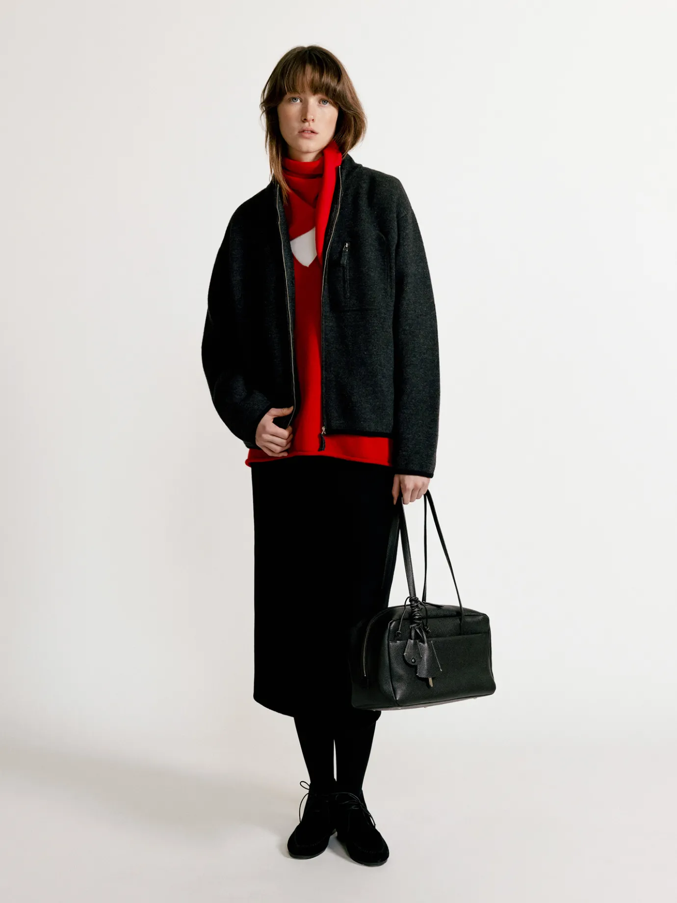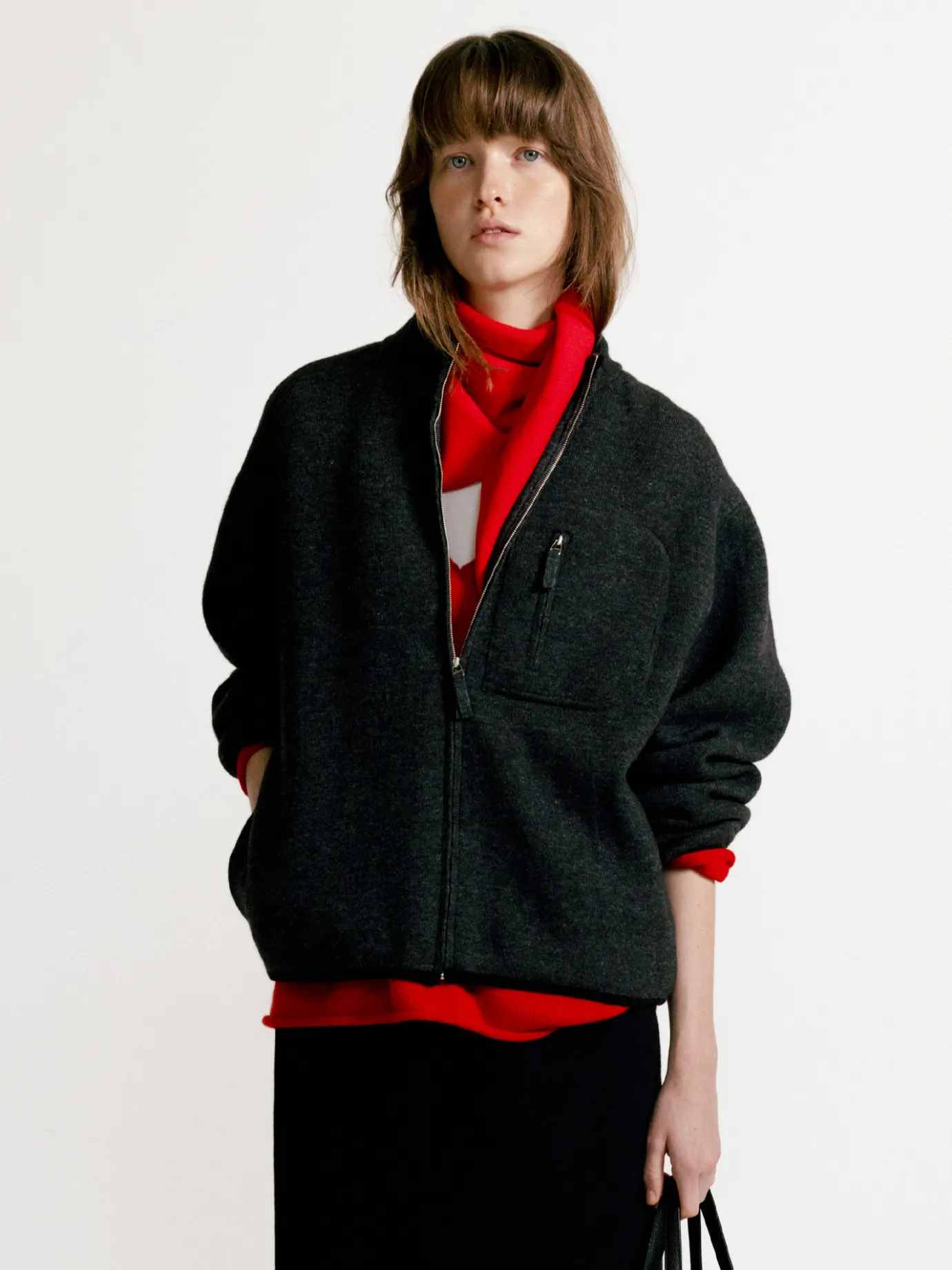 This is a basic knit top with a solid texture. It is a practical item that can be used as an outer or inner layer with a moderately loose fit. The spandex blended wool material provides excellent heat retention and provides a comfortable fit with its elastic and soft texture. The full zipper closure structure on the front is easy to wear and adds a casual mood. The chest pocket with zipper closure provides both practicality and a point detail, and the zipper slider is made of the same yarn to complete a sophisticated detail. The neckline finished with a dense rib structure and the hem and sleeves with contrasting color piping add a point to the simple design and create a neat look.