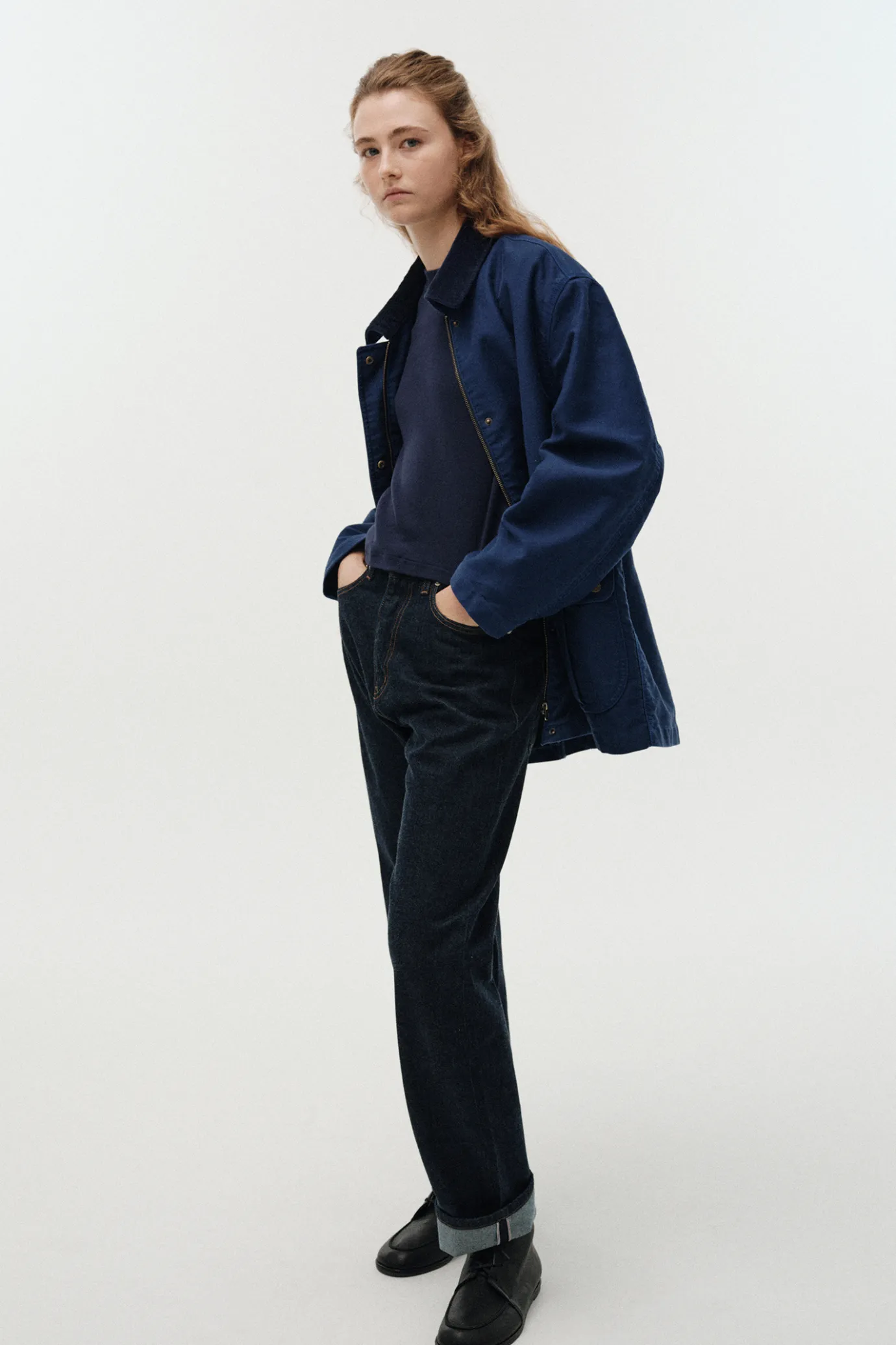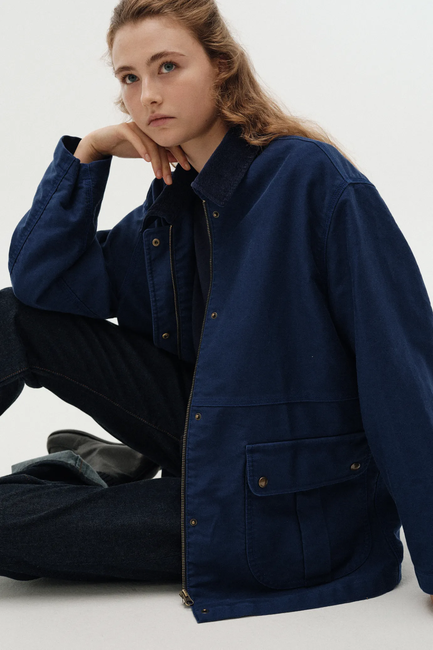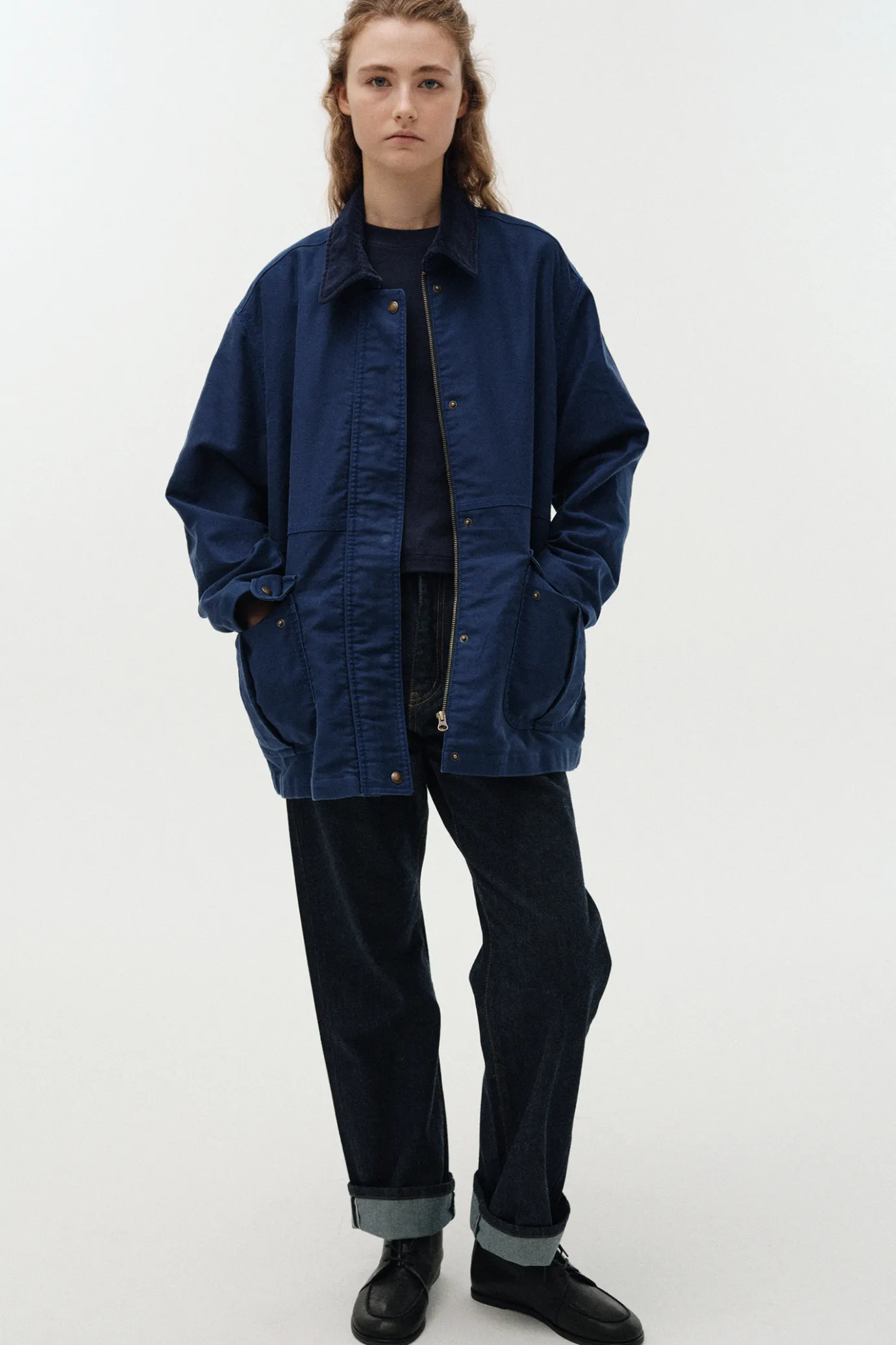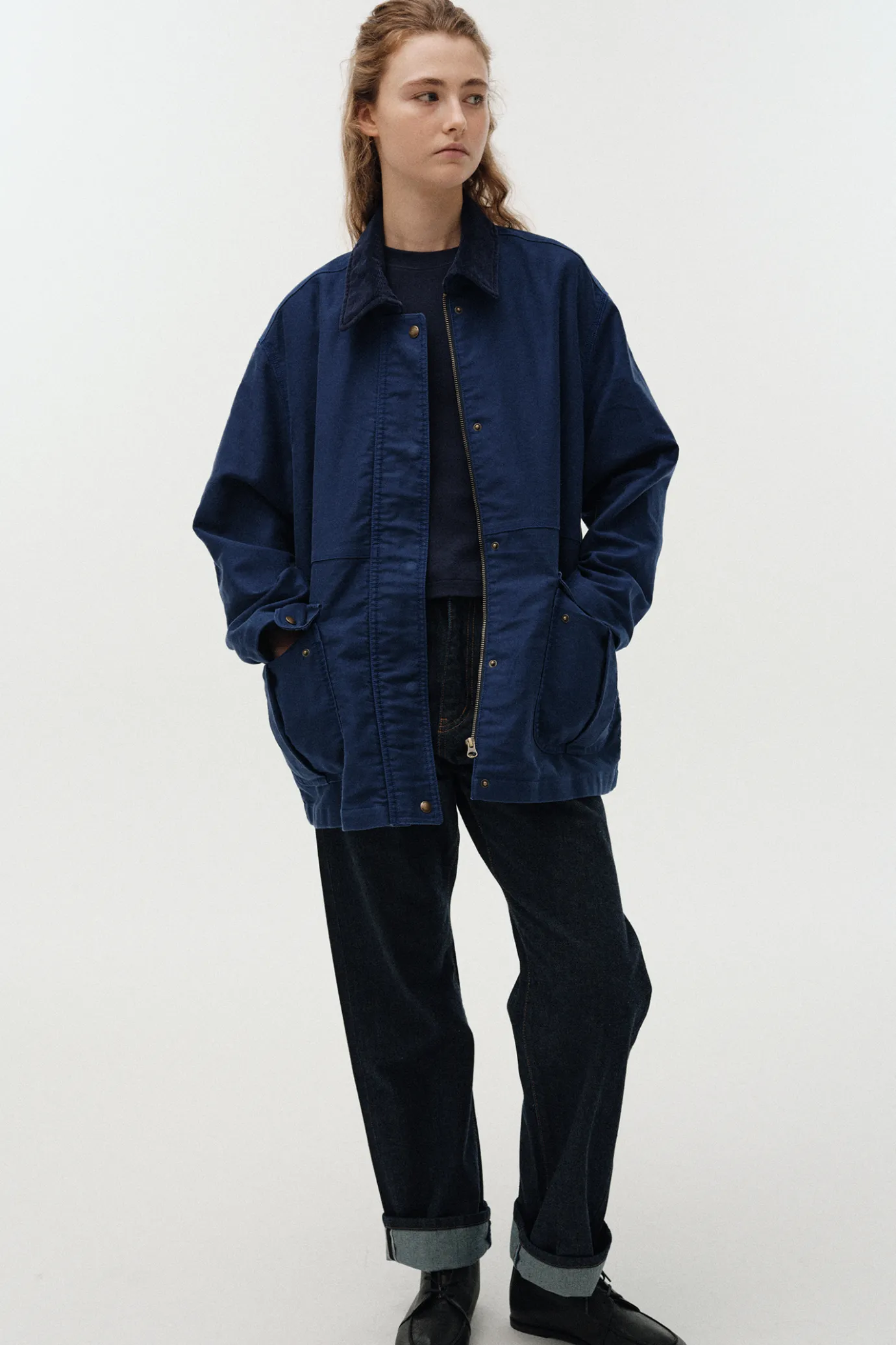 This hunting jacket is inspired by traditional British hunting jackets. Built to withstand outdoor environments, this jacket offers a relaxed silhouette for comfortable movement, and comes in classic khaki and blue tones for a focal point. Made with 100% cotton MOLE SKIN fabric from Japan's ROKAL, it boasts a sturdy yet soft touch. The densely woven fabric is resistant to wear and damage, and reflects Japan's ROKAL's sophisticated manufacturing process and high quality standards. The stone washing technique is applied to create a vintage feel through natural wear and color changes, and it provides a soft and flexible touch. A large pocket is placed on the front for added practicality, and a YKK zipper closure structure is applied inside the windbreaker placket to enhance warmth and functionality. In addition, the antique gold color snap closure with the Nothing Written logo and the corduroy collar fabric add a refreshing yet luxurious finish.
