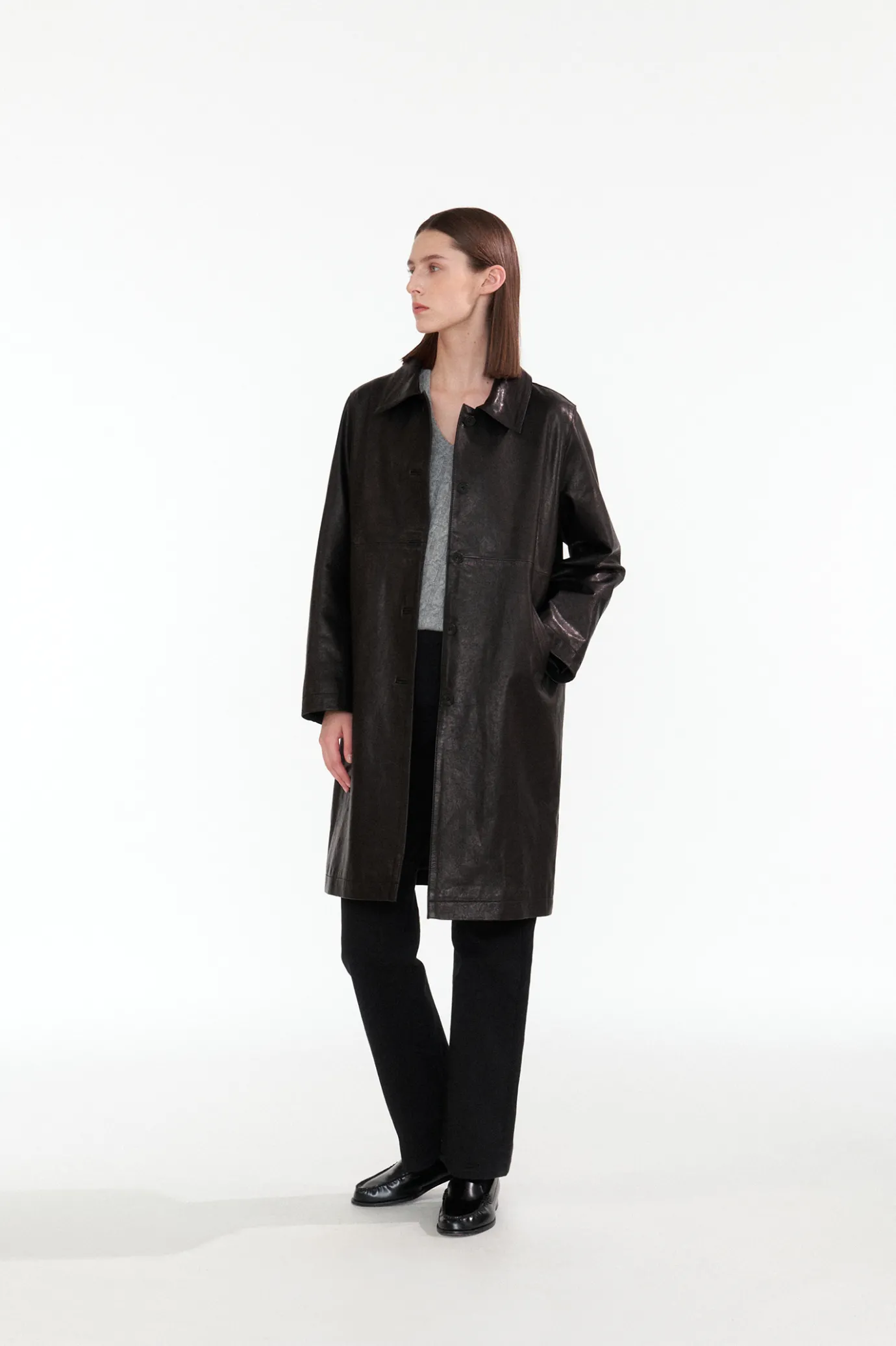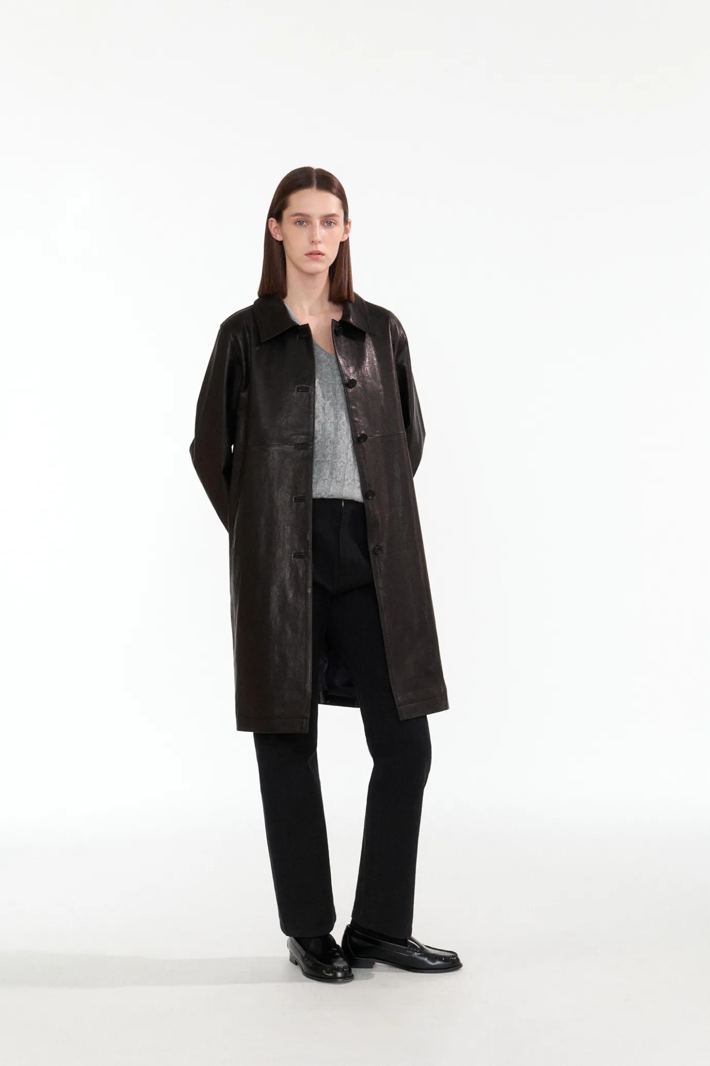 It is a vegetable lambskin coat that has a slim, straight silhouette that is attractive. This Italian vegetable lambskin boasts a light weight and soft touch. It provides a soft and light fit, and the moderate length of the midi length enhances activity. It is finished with a basic shirt-type neck collar and double stitching, and has a front five button fastening structure.