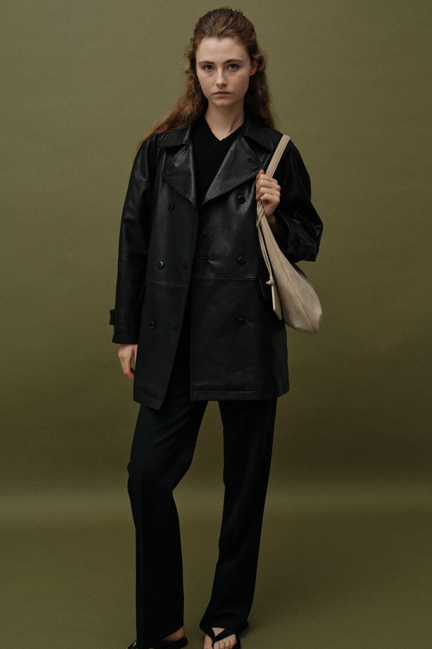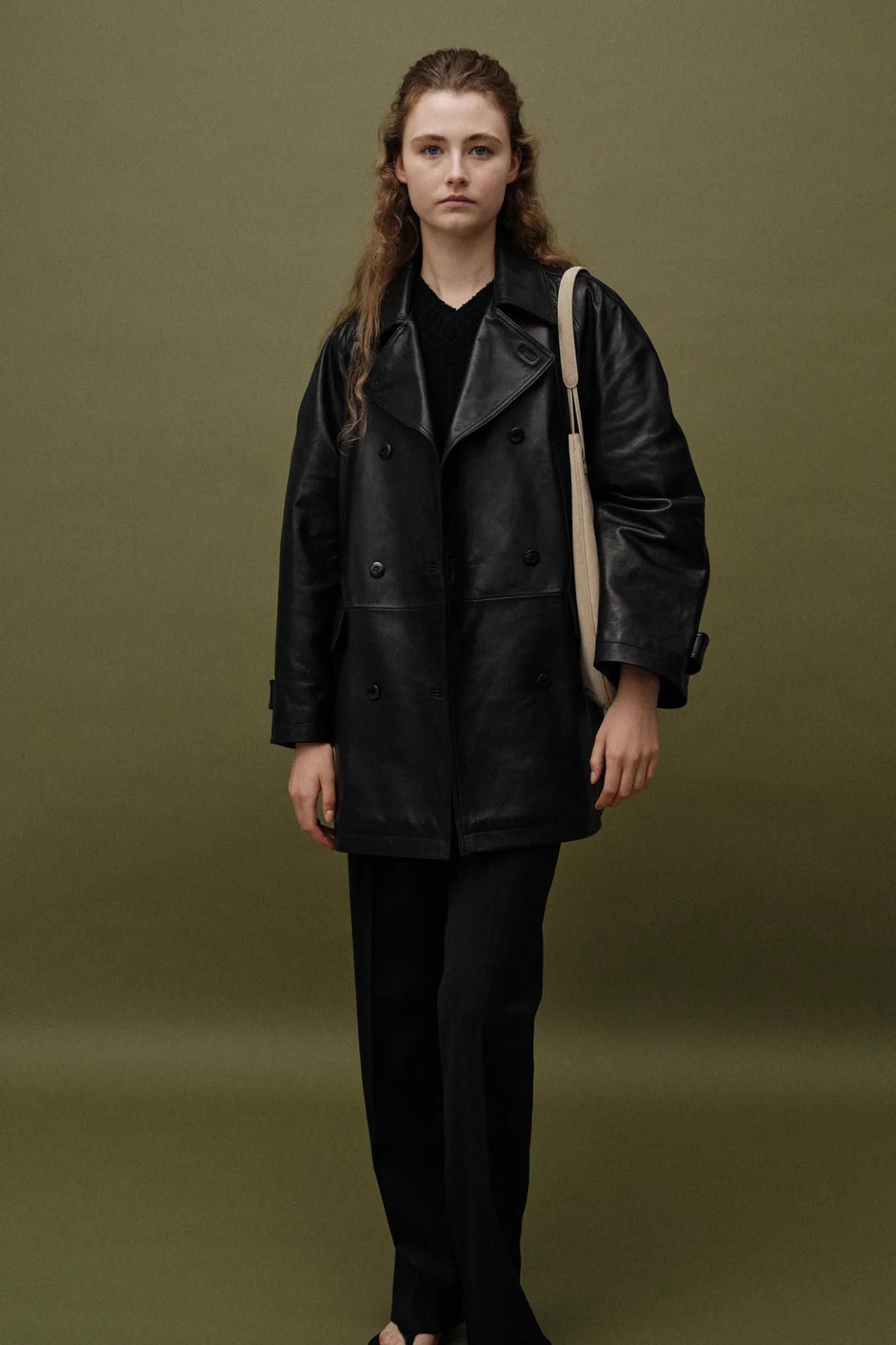 It is a classic-designed double-brested picot that originated from a traditional naval coat.It is a practical item with a moderate length and a generous silhouette, and features a double-brested structure and wide collar. It is made of vegetable ramskin dyed with vegetable tannins, and over time, natural gloss and color are added to bring out its unique style and luxurious texture. Lightweight, soft and flexible material naturally fits the body and is highly wearable and durable. Voluminous raglan sleeves provide a comfortable fit and activity, double-tight composition of bullhorn buttons and chest welt pockets and both side flap pockets for both practicality and usability.