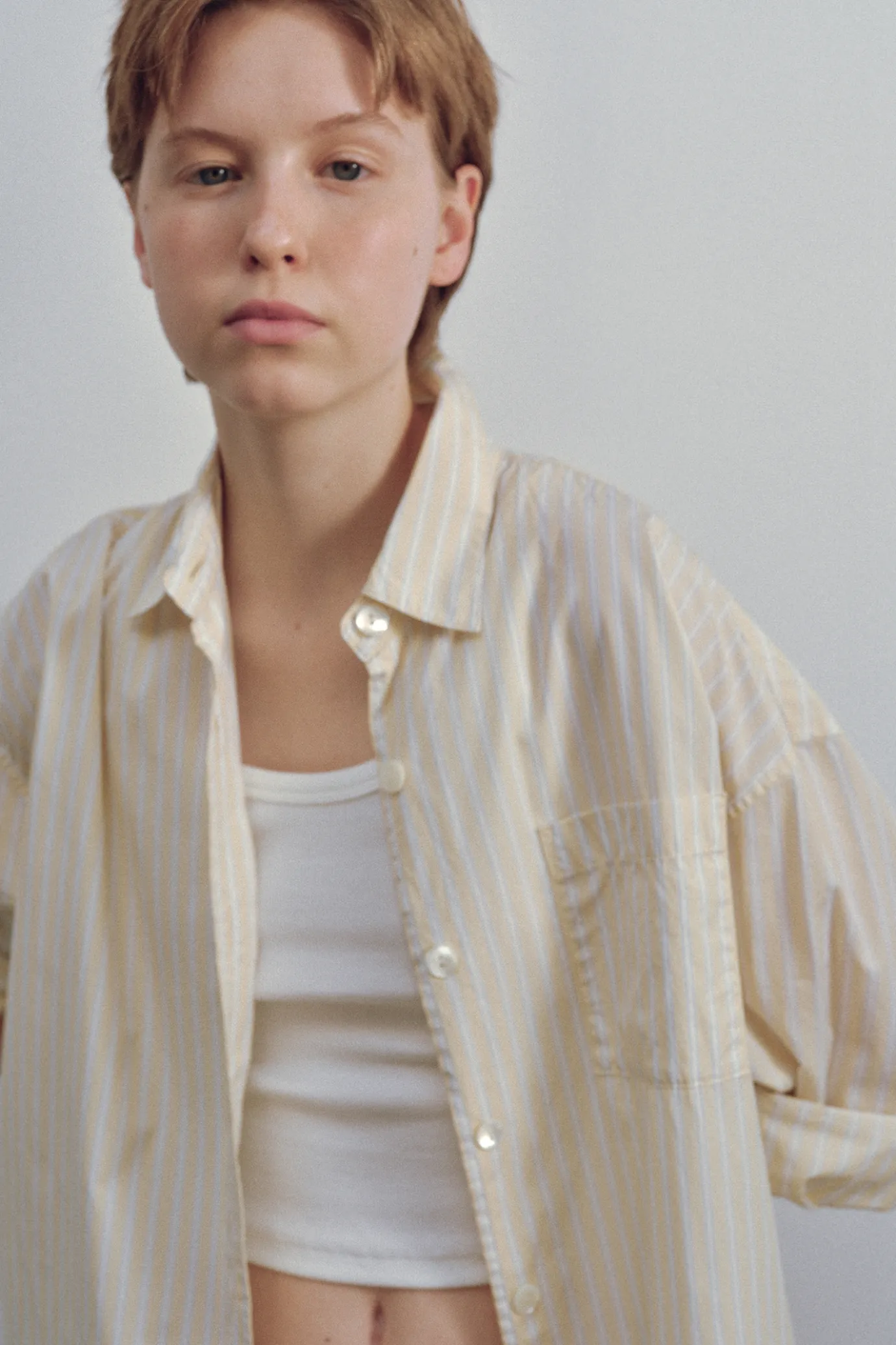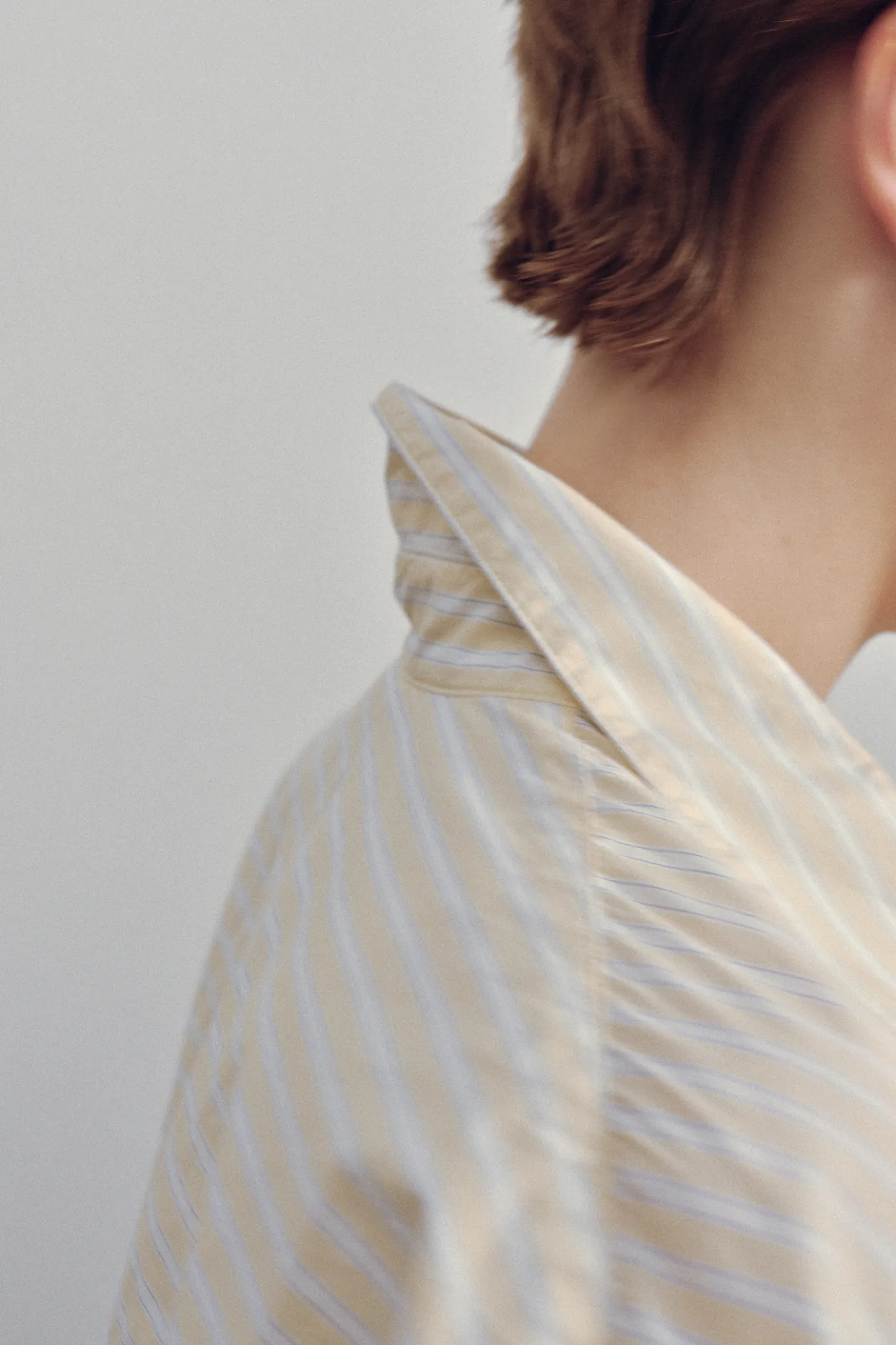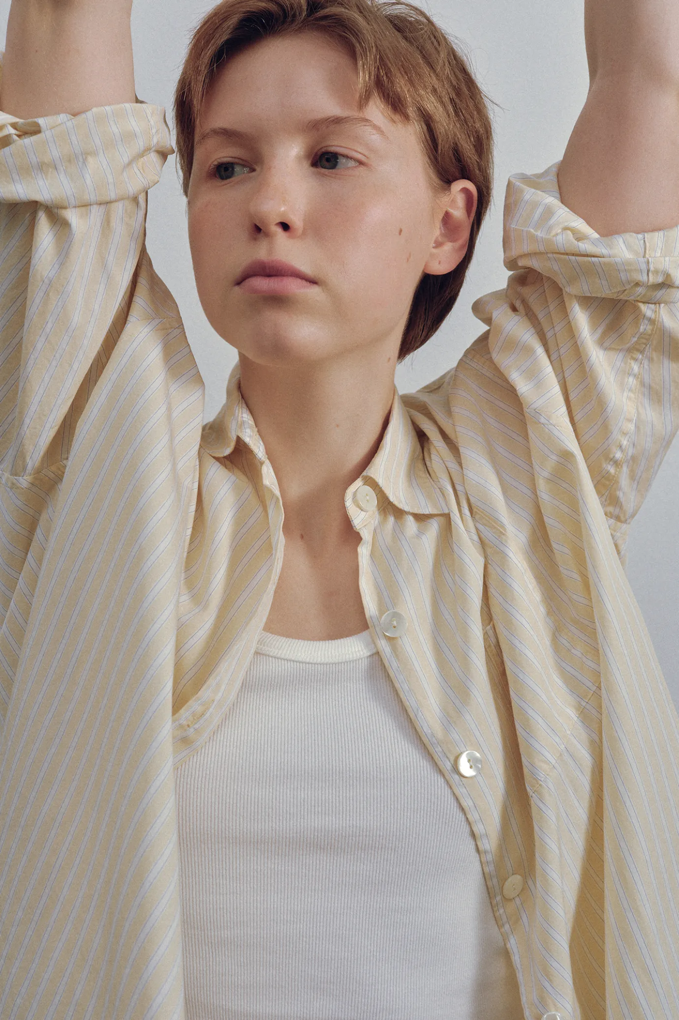 This is an oversized shirt with a calm stripe pattern. The thin fabric with vertically stretched stripes completes a com…