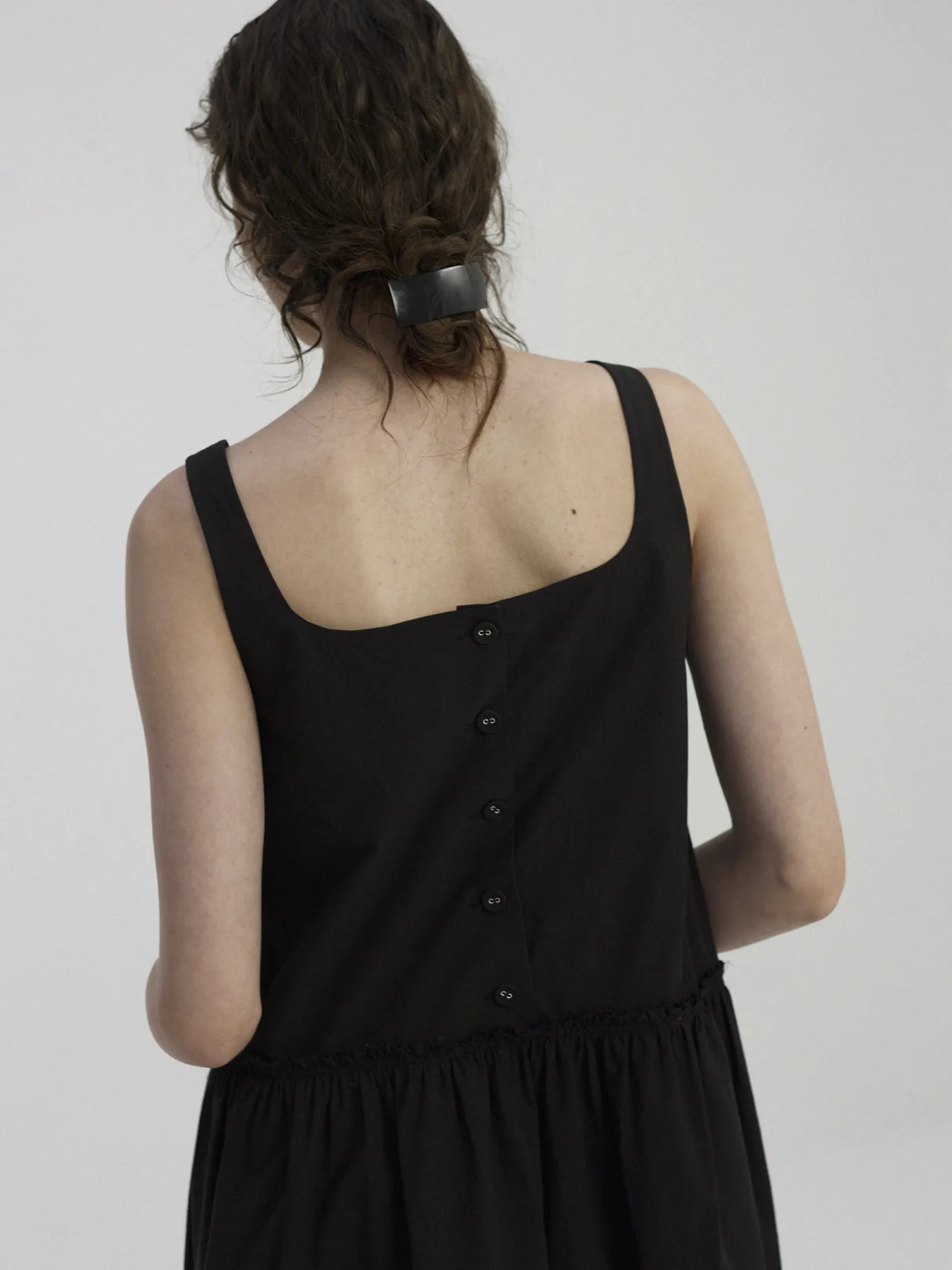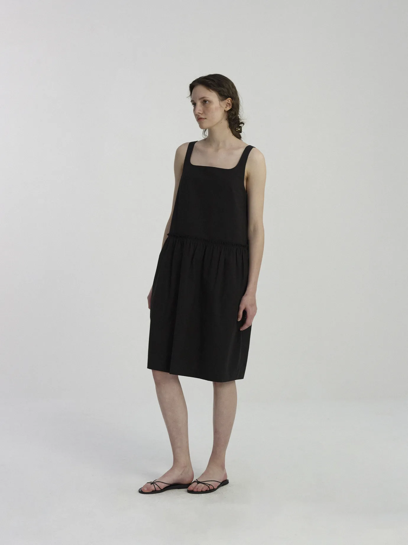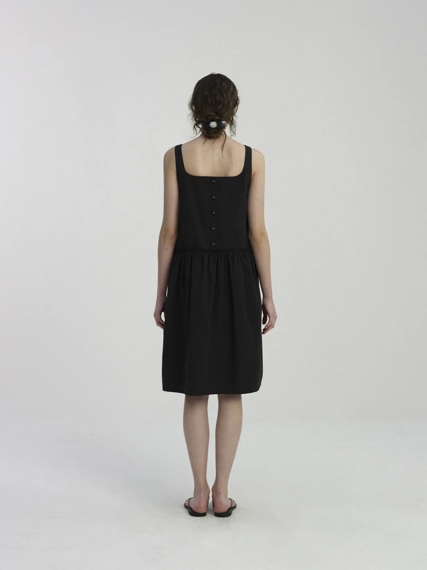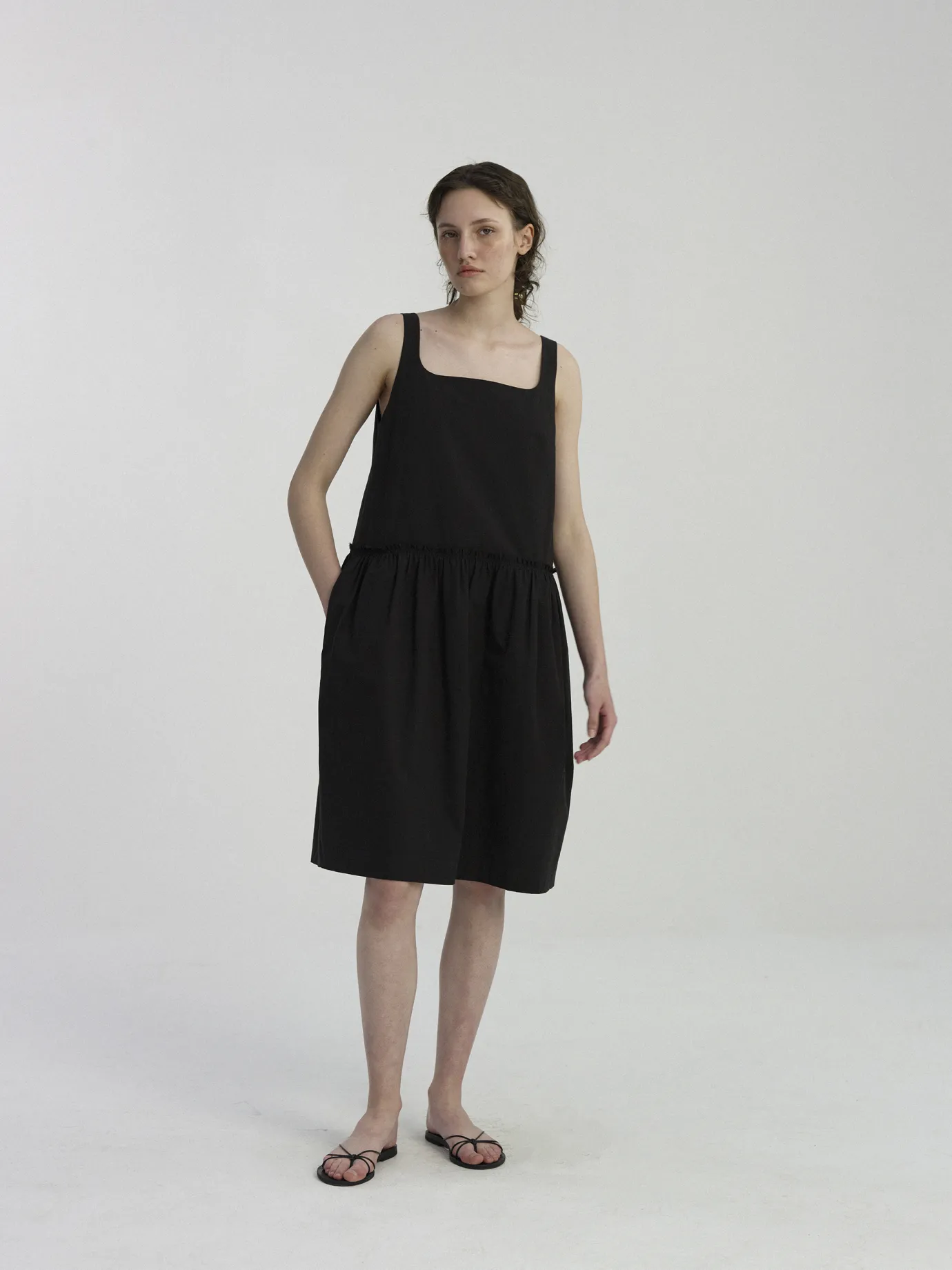 It’s a midi-length dress with an attractive square neckline. It shows off a natural pull-off with decoration cutting details along the down waistline, and it is an item that can be layered with a variety of innerwear with a wide armhole line. It is made of 60 water COTOTN 100% fabric and is processed with dyeing and bio-washing together, so it has a soft and natural wrinkle texture.The button closure is wrapped in the same fabric, so it can be worn regardless of the front and back, and the lining minimizes the see-through. Front side slash pocket configuration.