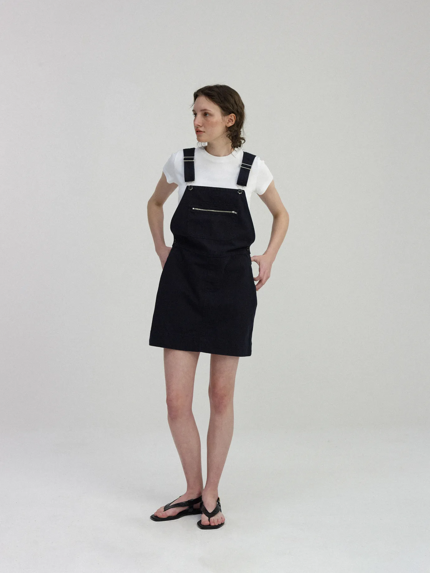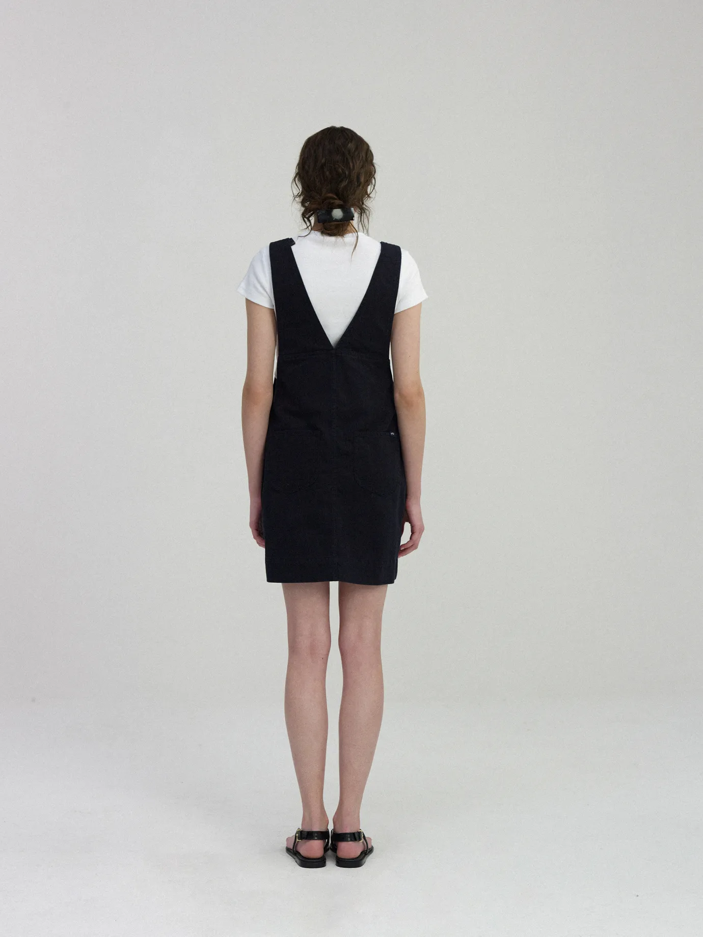 It’s a cotton overall skirt with a classic sensibility. Overall, it has a relaxed silhouette and no lining, so it feels cool to wear. A solid 16-sided twill fabric is added with bio-washing to relieve soft touch and contraction and show a vintage color. The nut buttons add casual sensibility and adjustable length with shoulder straps. The pocket structure of the zipper closure and both side pockets enhance storage and practicality, and the thick stitching is used for accentuation.