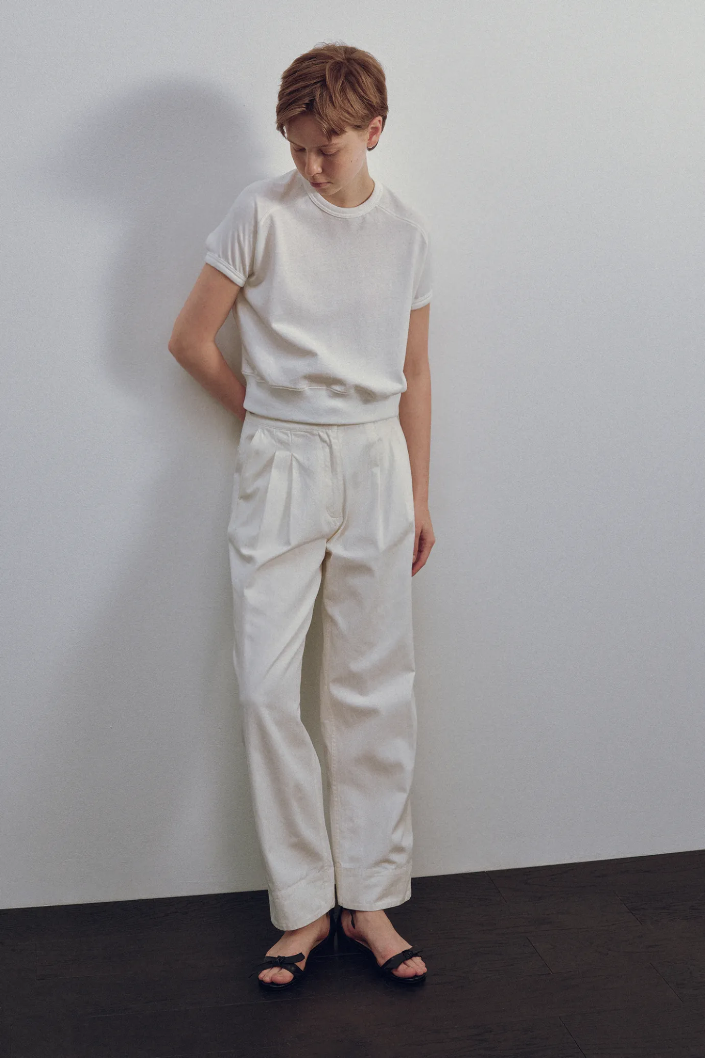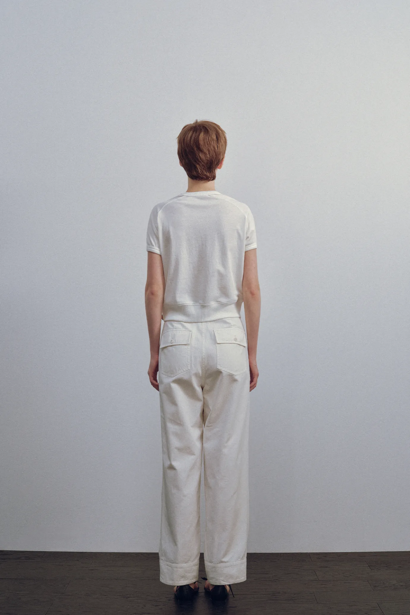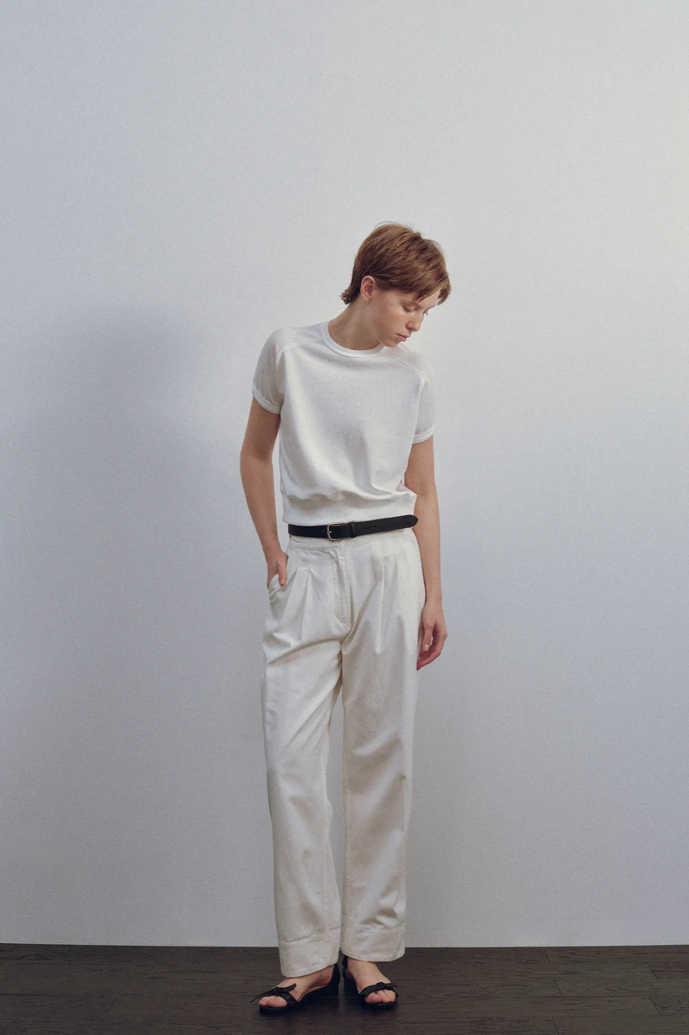This is a short sleeve sweatshirt with a basic design.Raglan sleeves provide a naturally falling sleeve line and a comfortable fit.It is made of a cotton and linen blend that is solid, light, and cool, so it can be worn casually not only for everyday activities but also for outdoor activities or sportswear. It is a highly utilized product that is composed of basic colors and is good for styling with a variety of products, and the elasticity is increased by finishing with the neckline, sleeves, and lip tissue at the bottom of the waist.